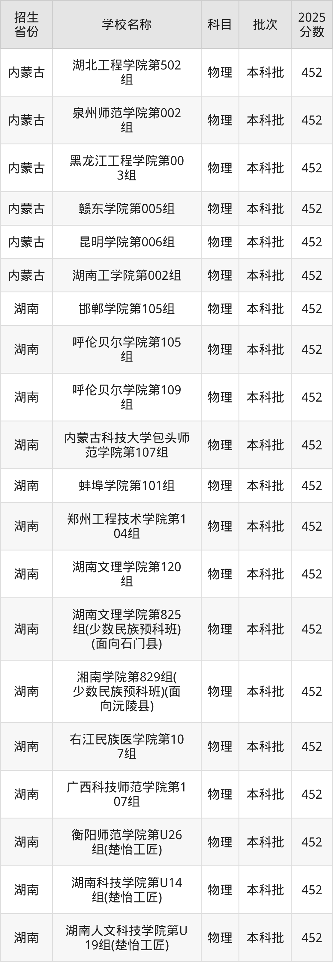 湖南省物理组分数线是452分的二本公办大学有:邯郸学院、呼伦贝尔学院、内蒙古科技大学包头师范学院、蚌埠学院、郑州工程技术学院、湖南文理学院、湘南学院、右江民族医学院、广西科技师范学院、衡阳师范学院。