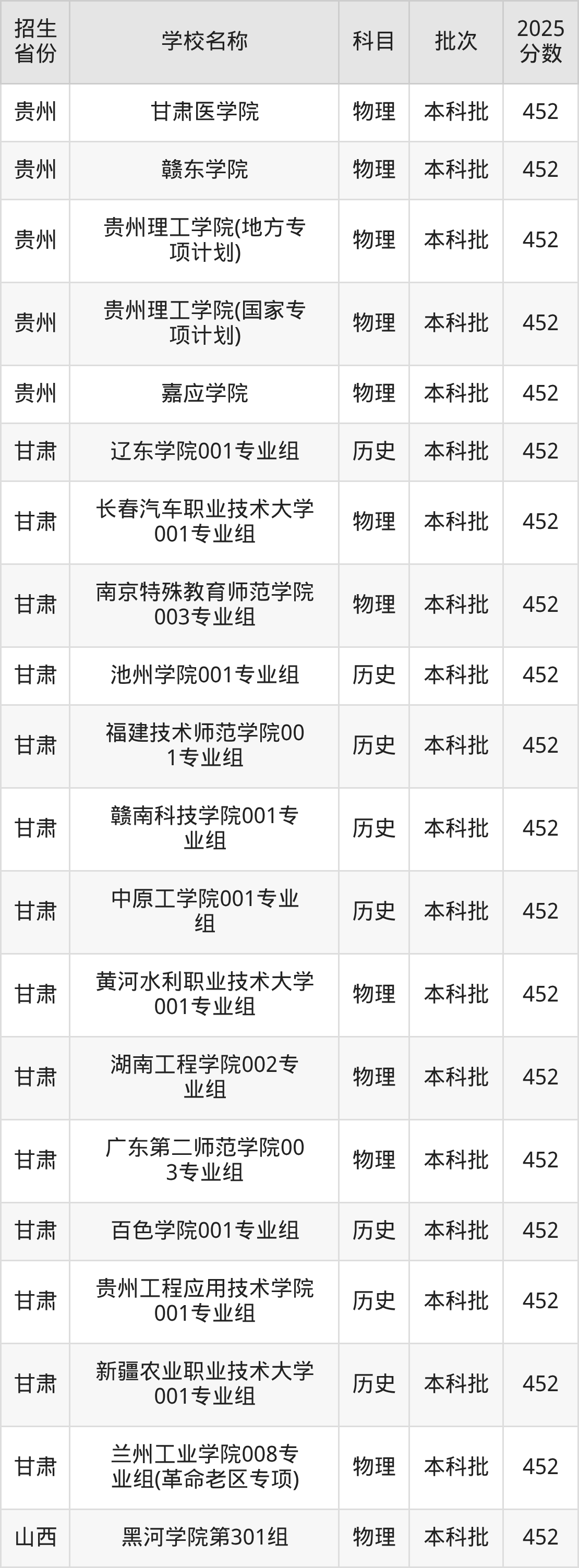 甘肃省历史组分数线是452分的二本公办大学有:辽东学院、池州学院、福建技术师范学院、赣南科技学院、中原工学院、百色学院、贵州工程应用技术学院、新疆农业职业技术大学。