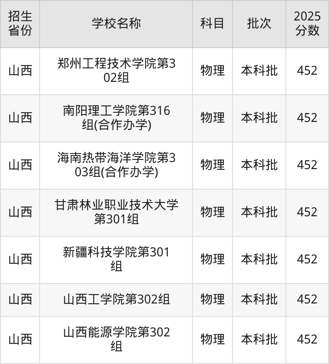 山西省物理组分数线是452分的二本公办大学有:黑河学院、郑州工程技术学院、南阳理工学院、海南热带海洋学院、甘肃林业职业技术大学、新疆科技学院、山西工学院、山西能源学院。