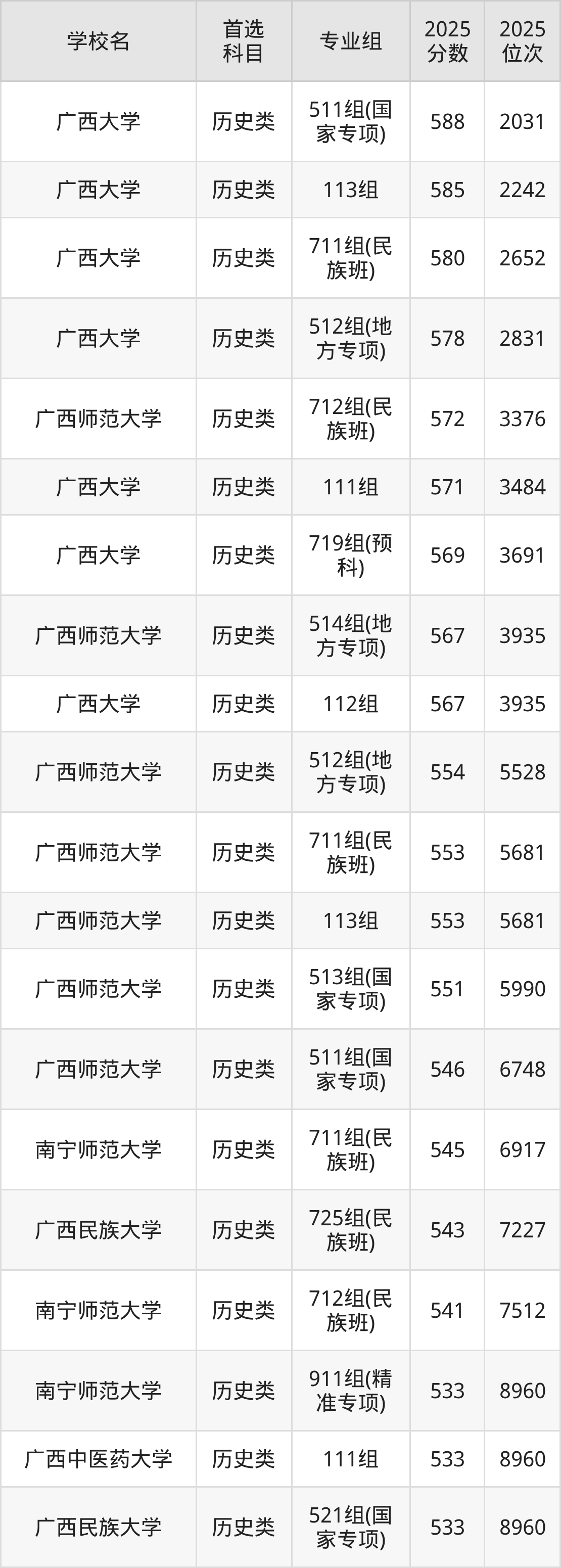 2025年一共有11所一本大学在广西历史类招生,包含了76个专业组,录取分数线从429分到588分不等,对应最低位次从40781名到2031名。下面分别展示广西壮族自治区分数线最高、最低的五个院校专业组。
