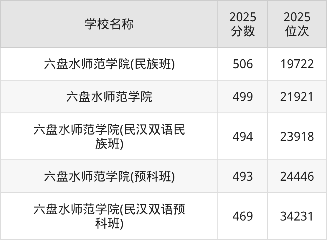 下文为2025年六盘水市二本师范大学在贵州历史类录取分数线和位次排名表,供大家参考: