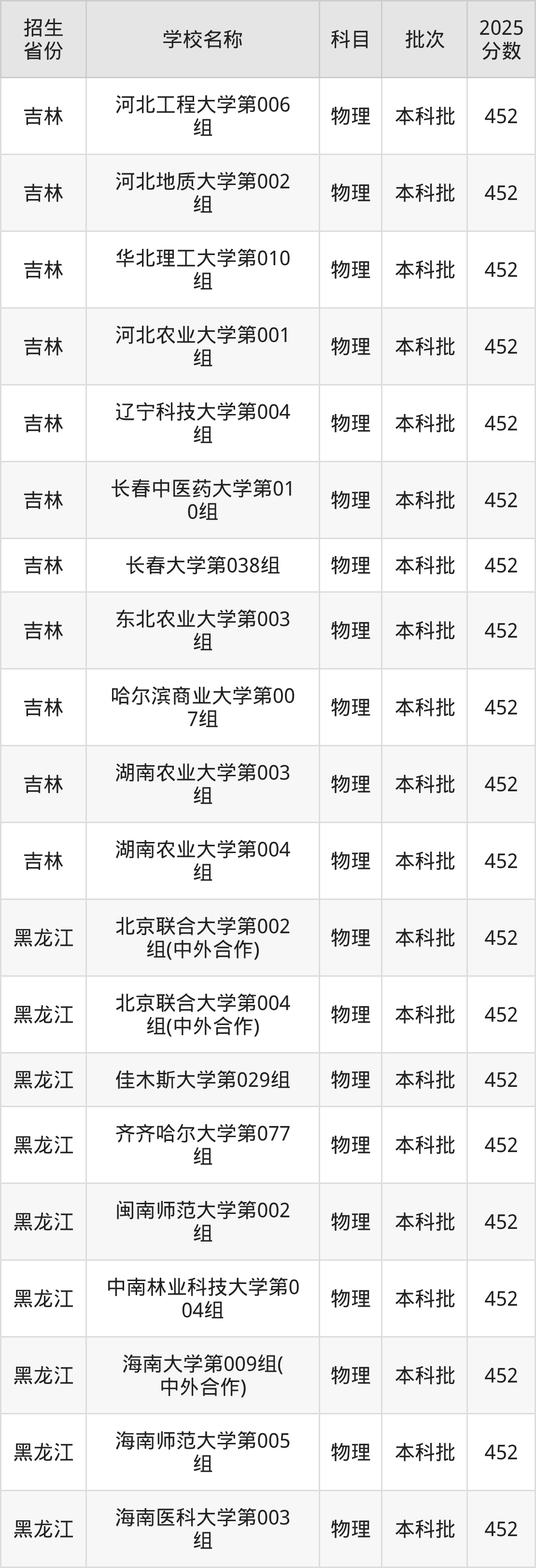 黑龙江省物理组分数线是452分的一本大学有:北京联合大学、佳木斯大学、齐齐哈尔大学、闽南师范大学、中南林业科技大学、海南大学、海南师范大学、海南医科大学、天水师范大学。