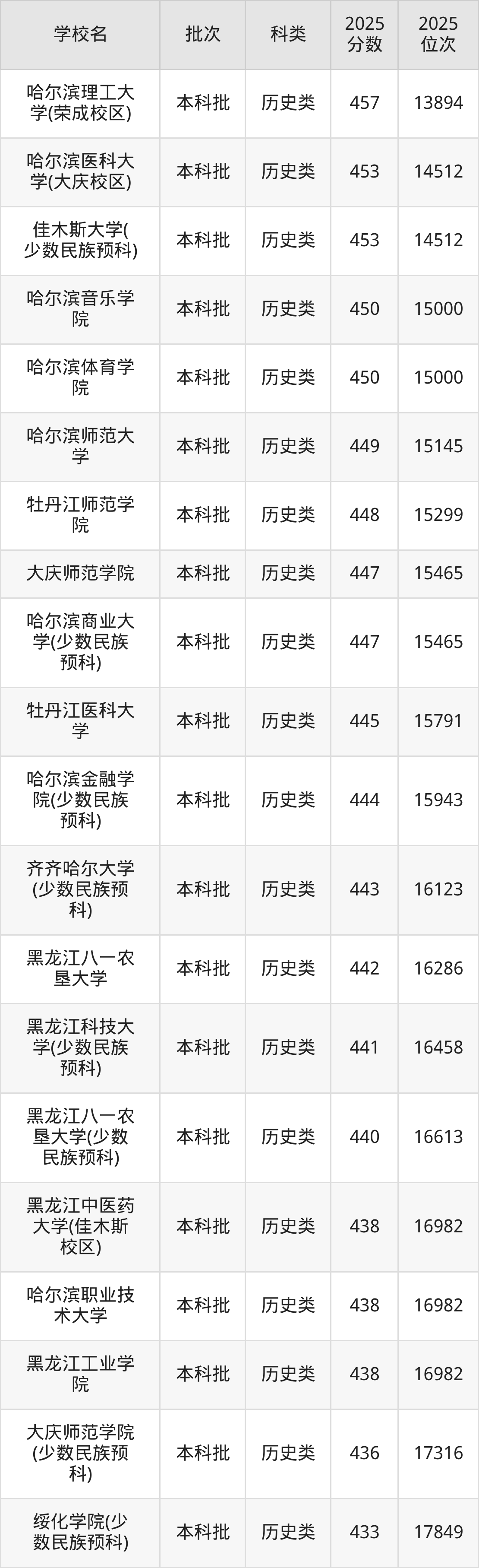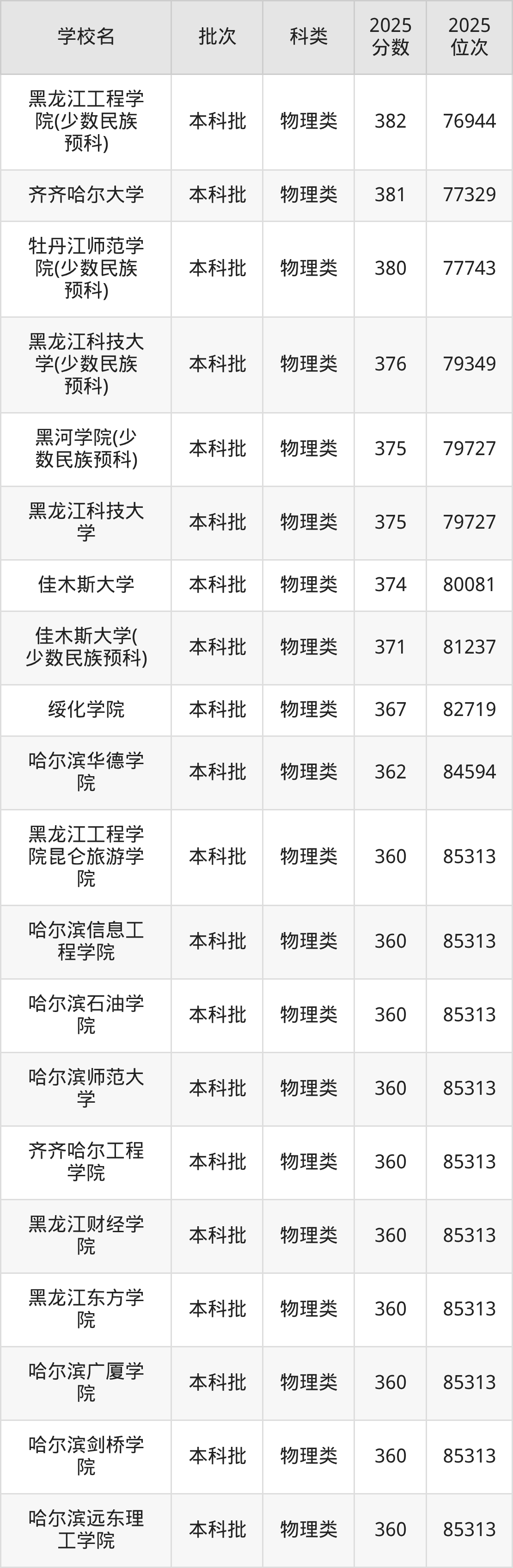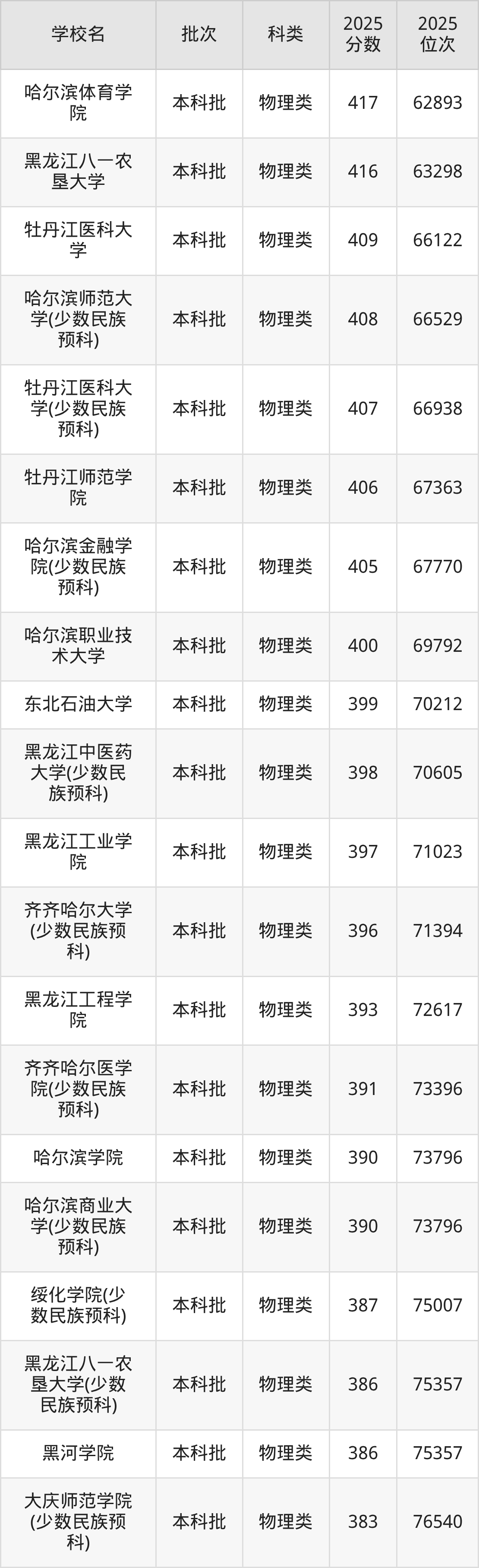 下面是2025年黑龙江本科大学最低录取分数线一览表: