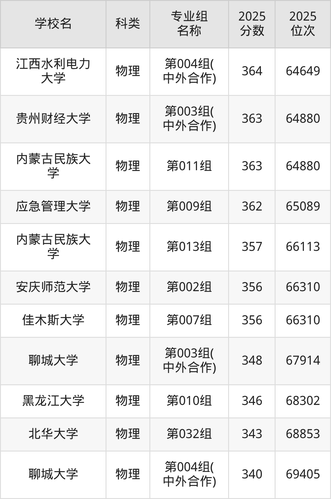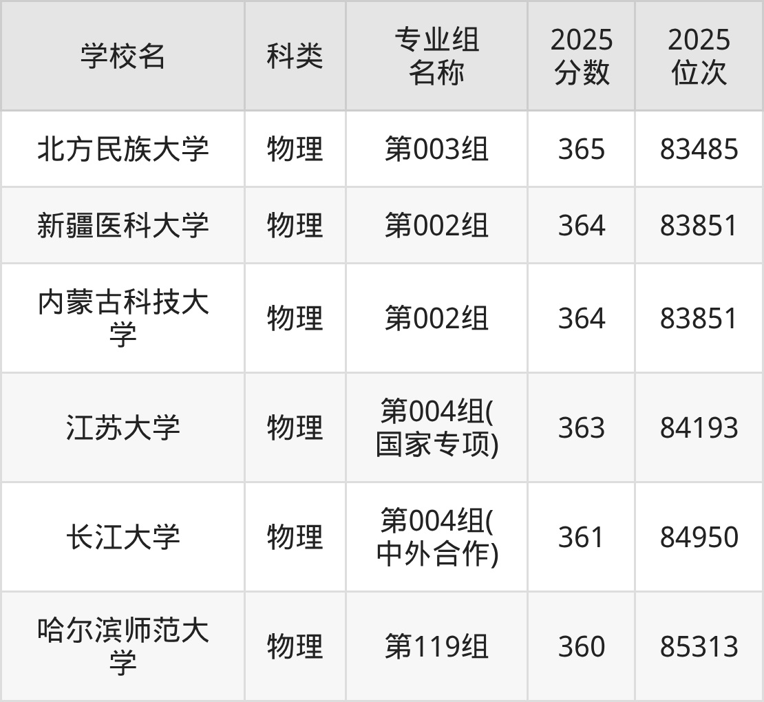 下面是吉林物理类365分能上的一本大学排名一览表: