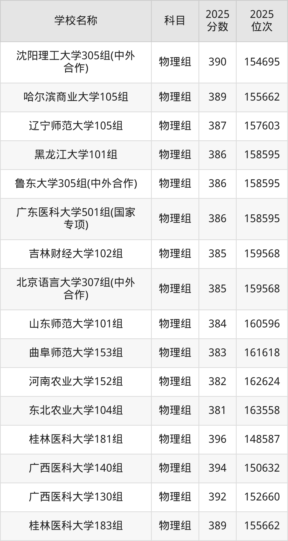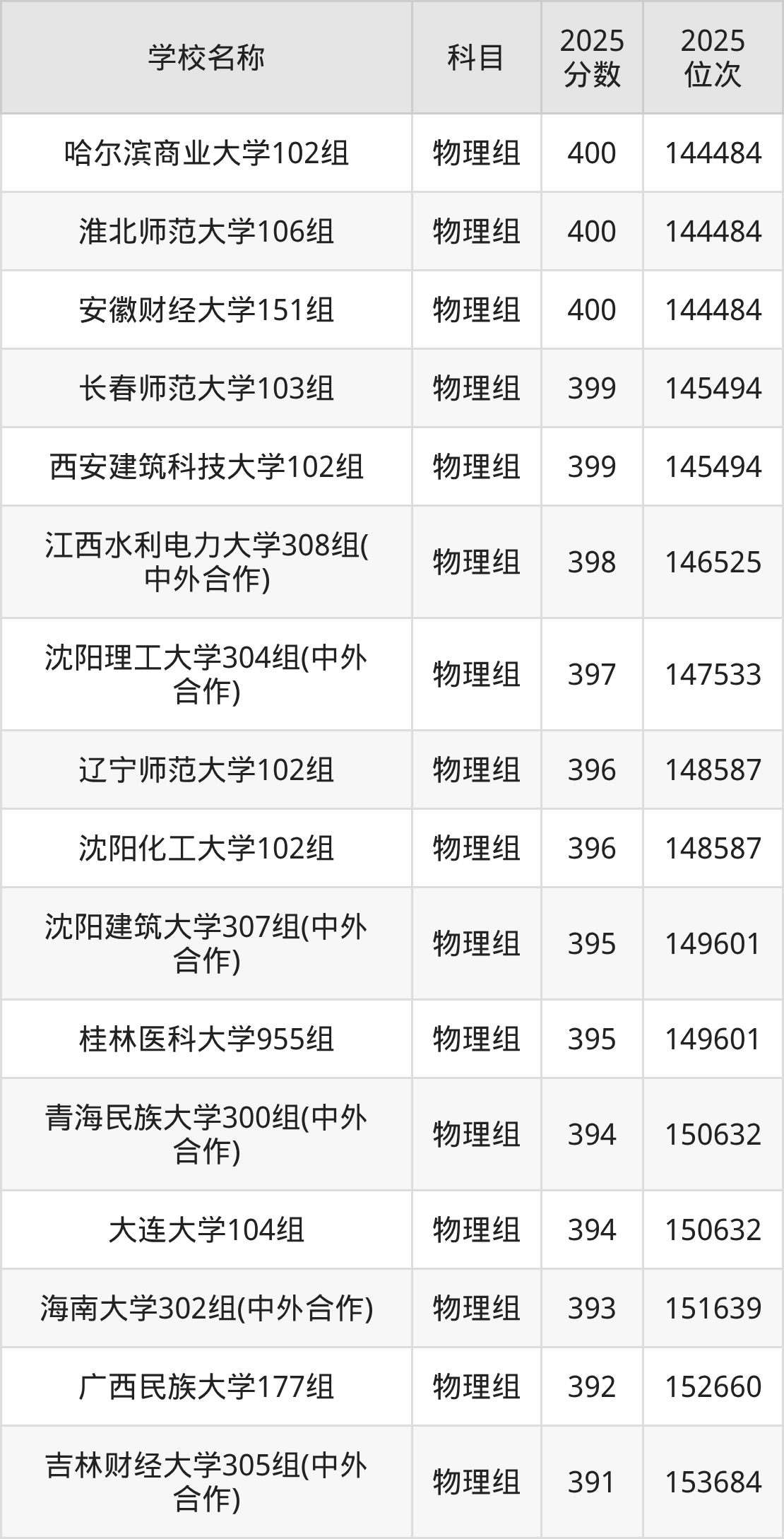 广西高考物理组共有26所一本大学在380到400分之间录取,包含哈尔滨商业大学、淮北师范大学、安徽财经大学、长春师范大学、西安建筑科技大学、江西水利电力大学、沈阳理工大学、沈阳化工大学、辽宁师范大学、桂林医科大学。