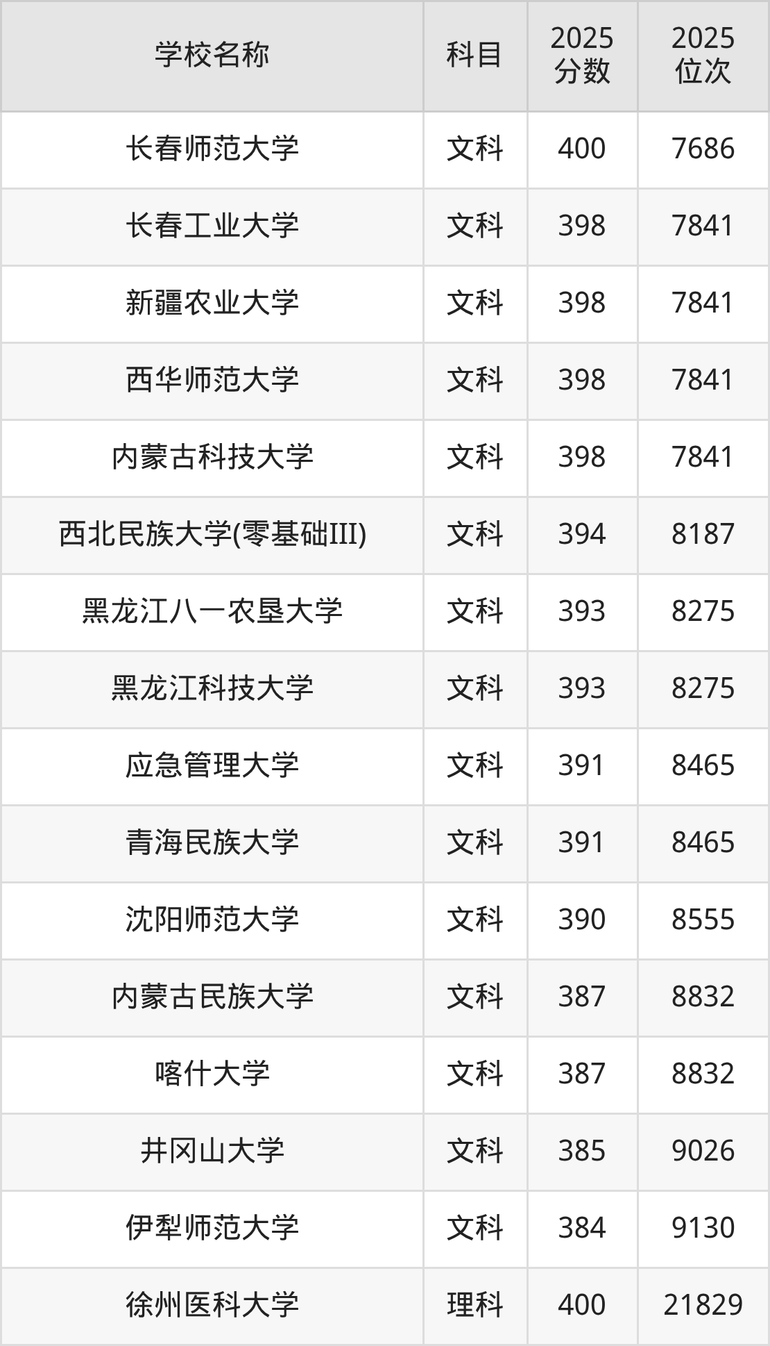 新疆高考文科共有15所一本大学在380到400分之间录取,包含长春师范大学、内蒙古科技大学、长春工业大学、西华师范大学、新疆农业大学、西北民族大学(零基础III)、黑龙江科技大学、黑龙江八一农垦大学、青海民族大学、应急管理大学。