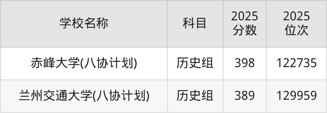 河北高考历史组共有2所一本大学在380到400分之间录取,包含赤峰大学(八协计划)、兰州交通大学(八协计划)。
