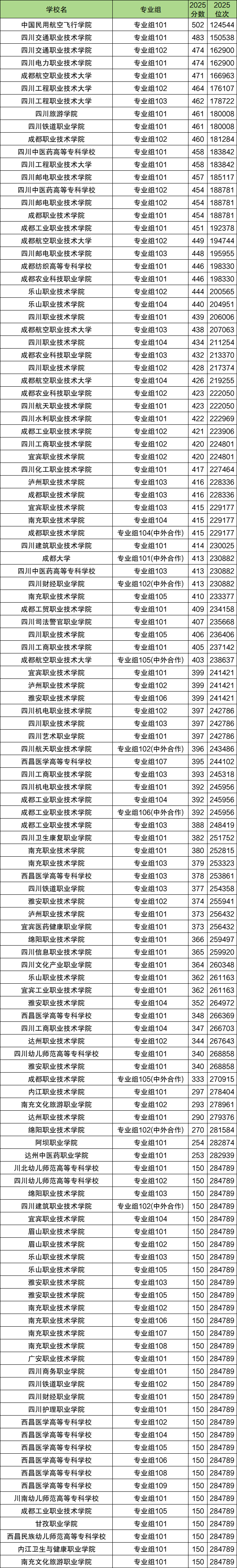 保底梯队:川南幼儿师范高等专科学校 101 组、乐山职业技术学院 104 组等多个专业组,最低录取分均为 150 分(位次 177978),为过线考生提供保底选择。
