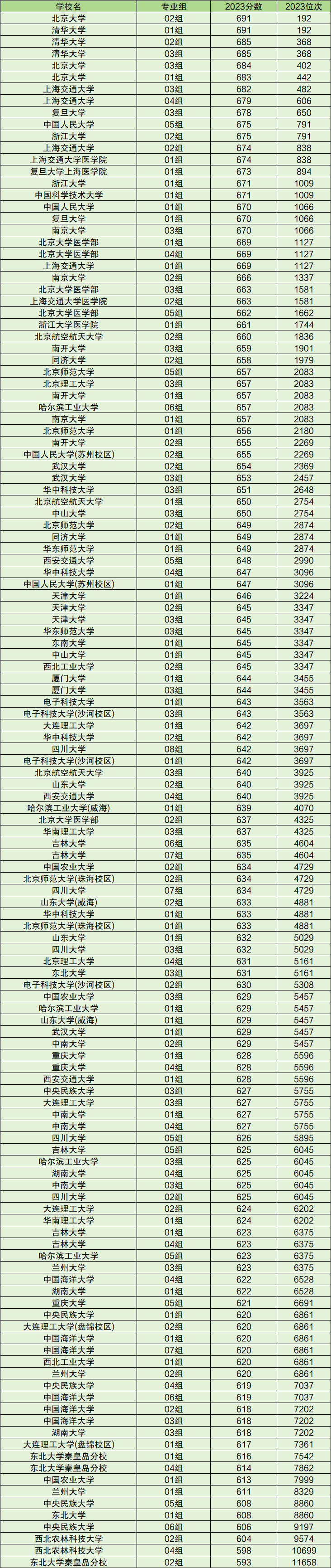 2023年全国985大学录取分数线位于593分到691分之间,对应录取位次从11658名到192名。分数线最高的是北京大学02组和清华大学01组,分数线最低的是东北大学秦皇岛分校02组。