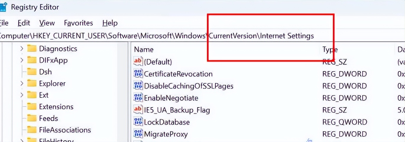 打开注册表编辑器后,可直接复制以下路径粘贴到地址栏快速定位(无需手动逐层查找):HKEY_CURRENT_USERSoftwareMicrosoftWindowsCurrentVersionInternet Settings;