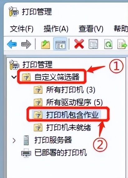 2、打印管理窗口,左侧点击展开【自定义筛选器】,再点击【打印机包含作业】;