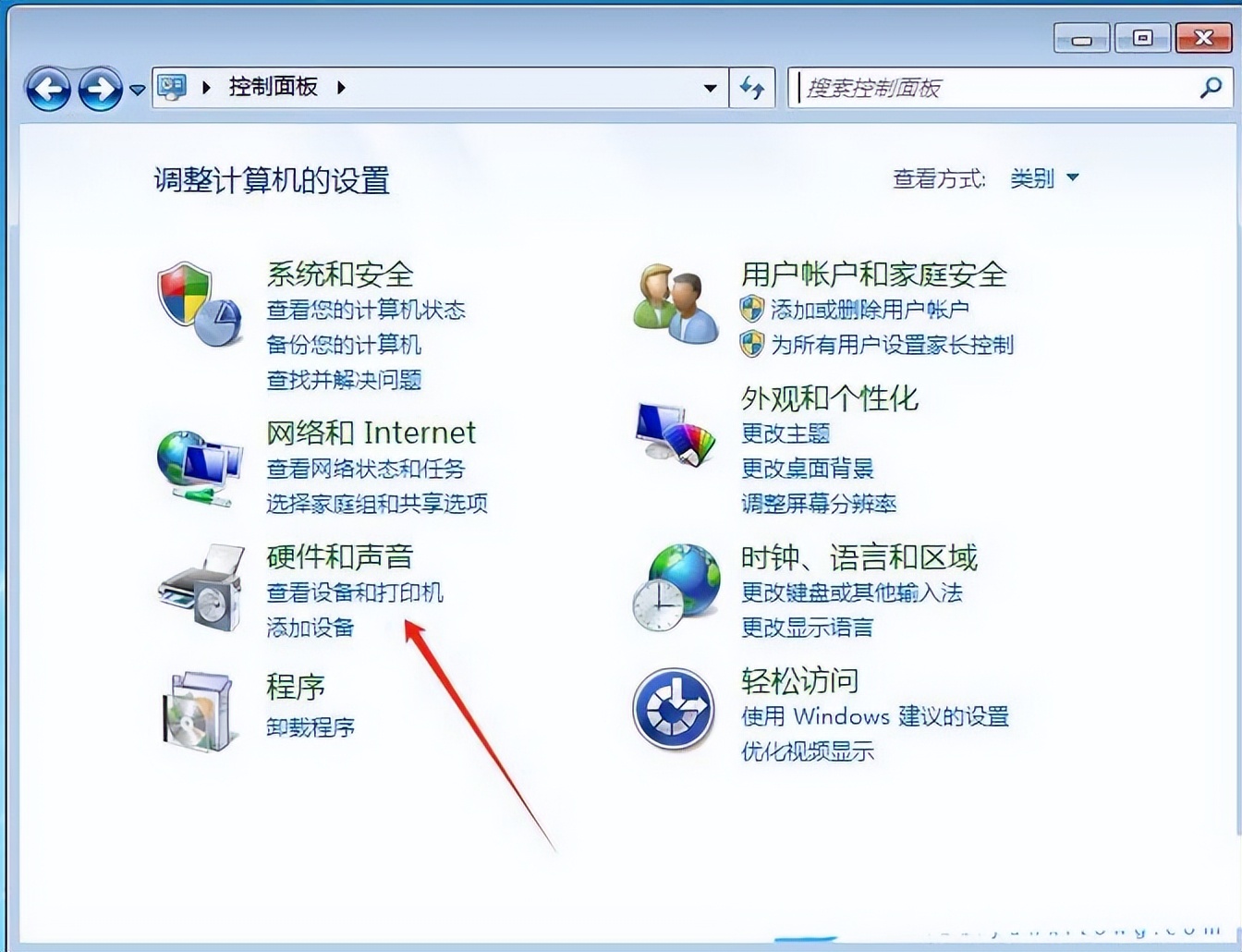 1、首先,打开控制面板界面,找到“硬件和声音”,点击下方的“查看设备和打印机”。