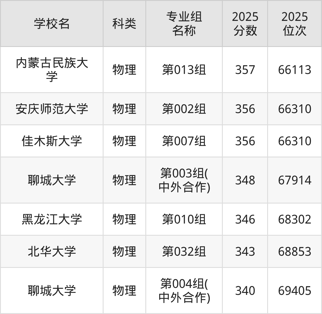 一、吉林360分能上的一本大学排名表2025年吉林物理类本科线为340分,360分能上的一本大学共计6所,其中公办大学录取位次排名最低的是聊城大学(第004组(中外合作)340分),其2025最低位次为69405名。