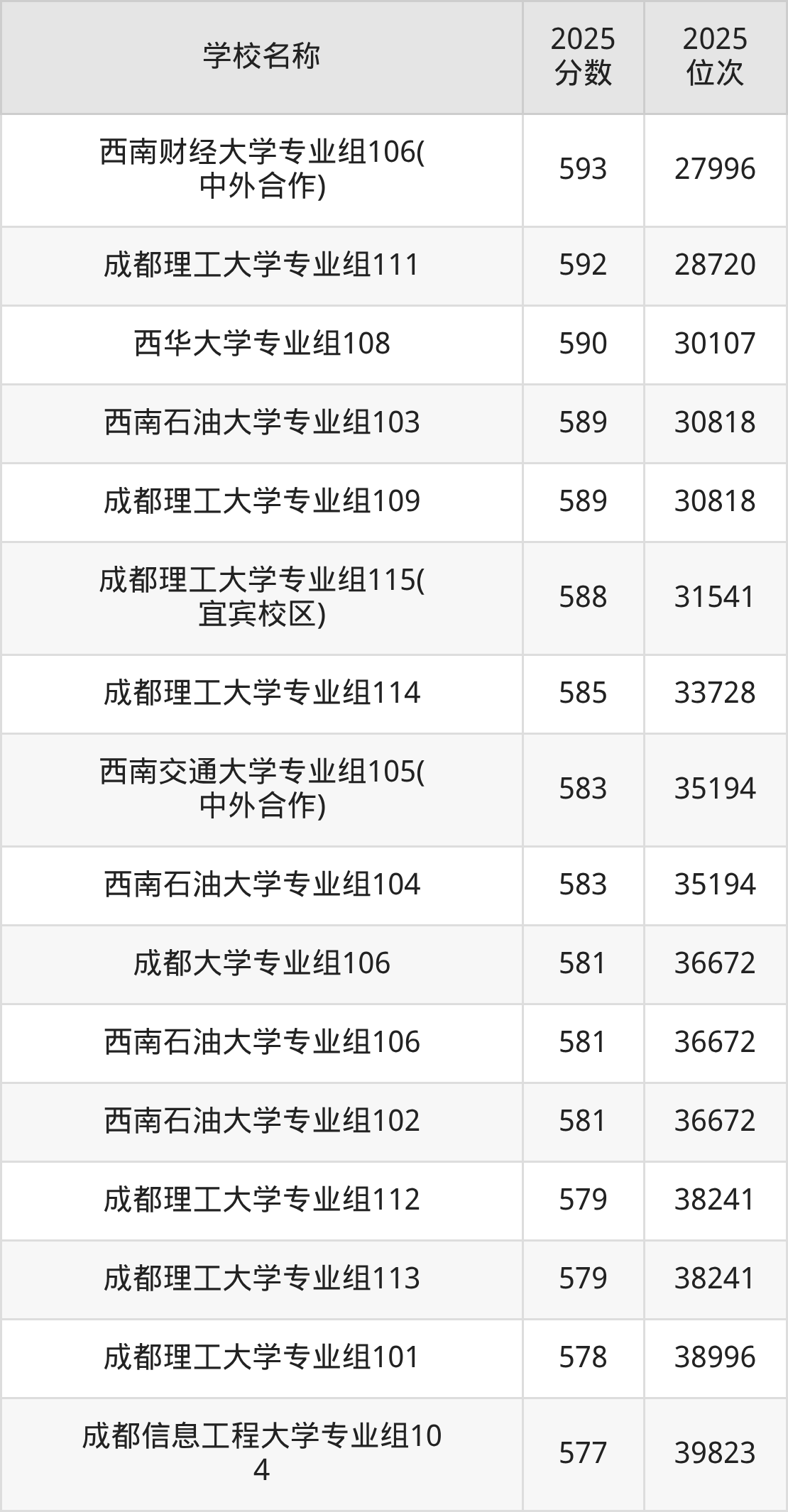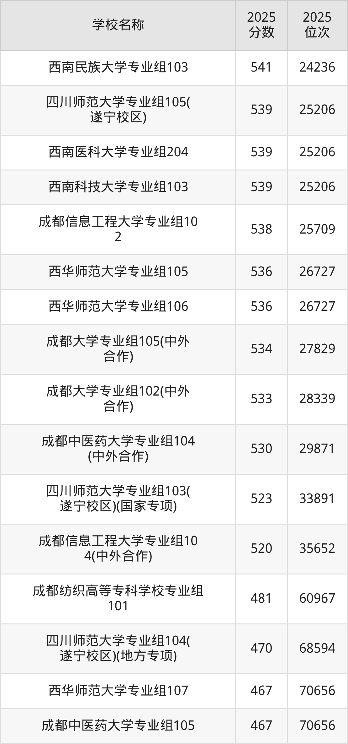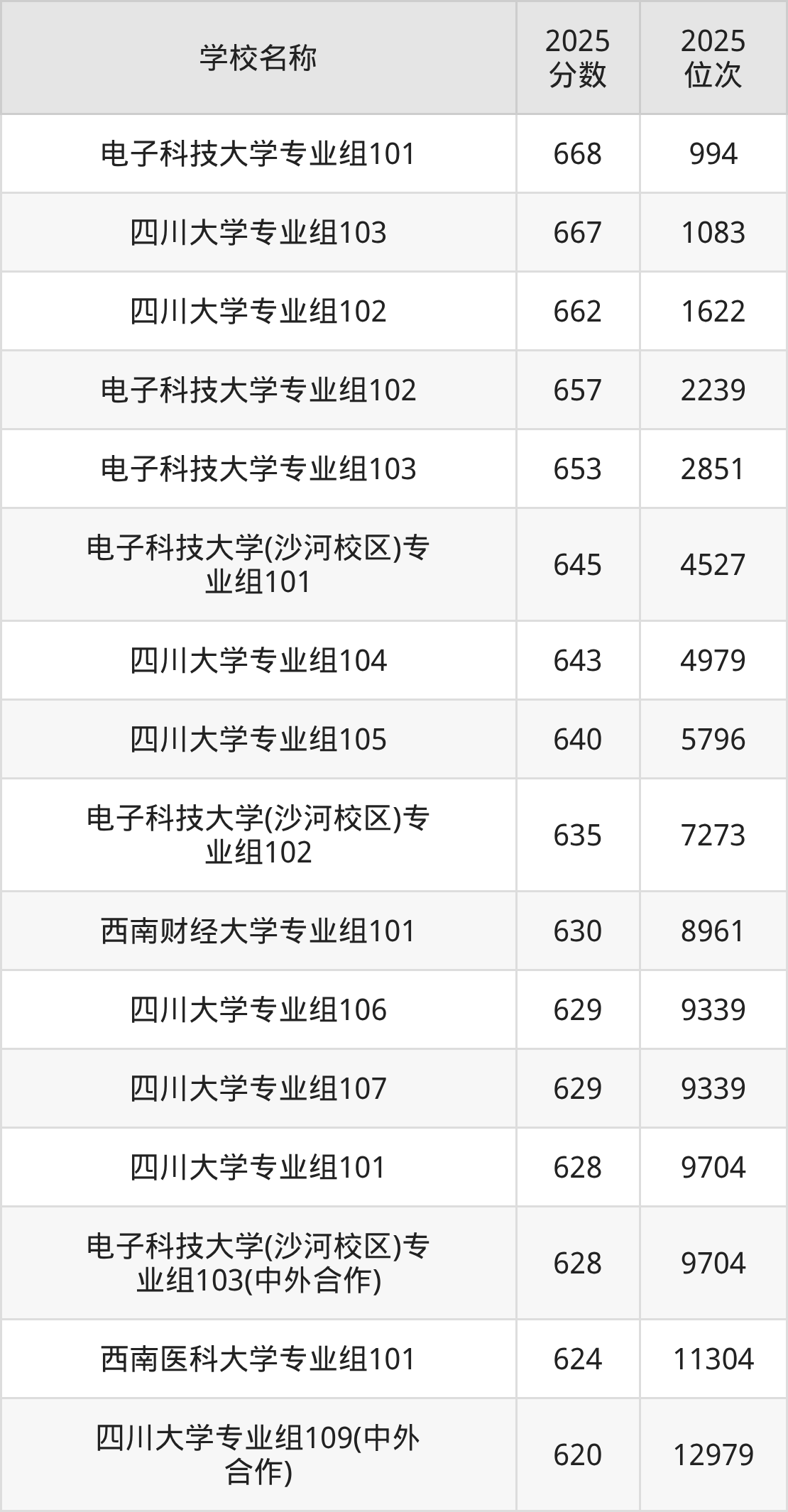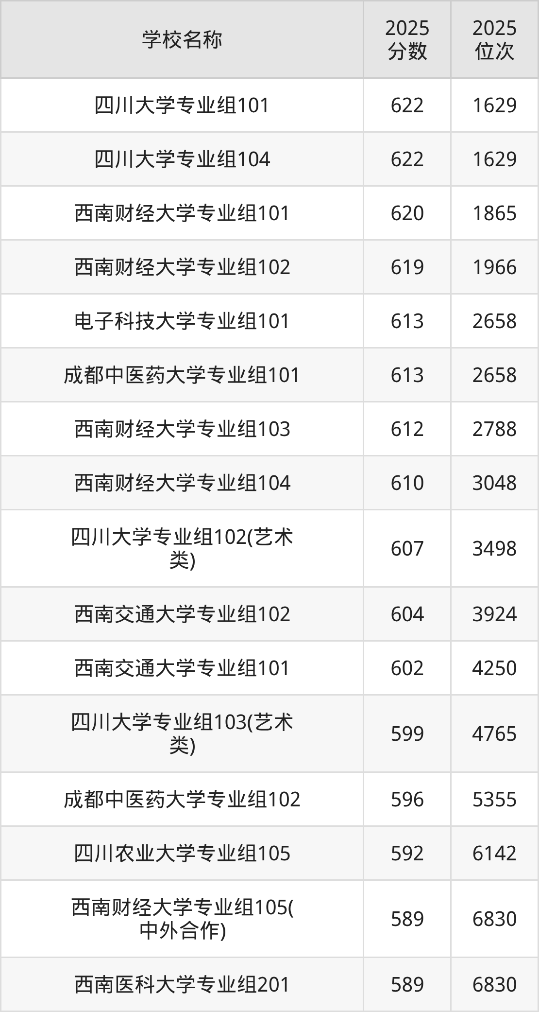 下文为2025年四川省一本大学在四川物理类录取分数线和位次排名表,供大家参考: