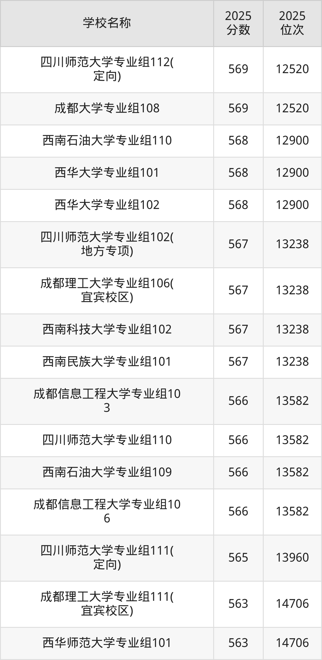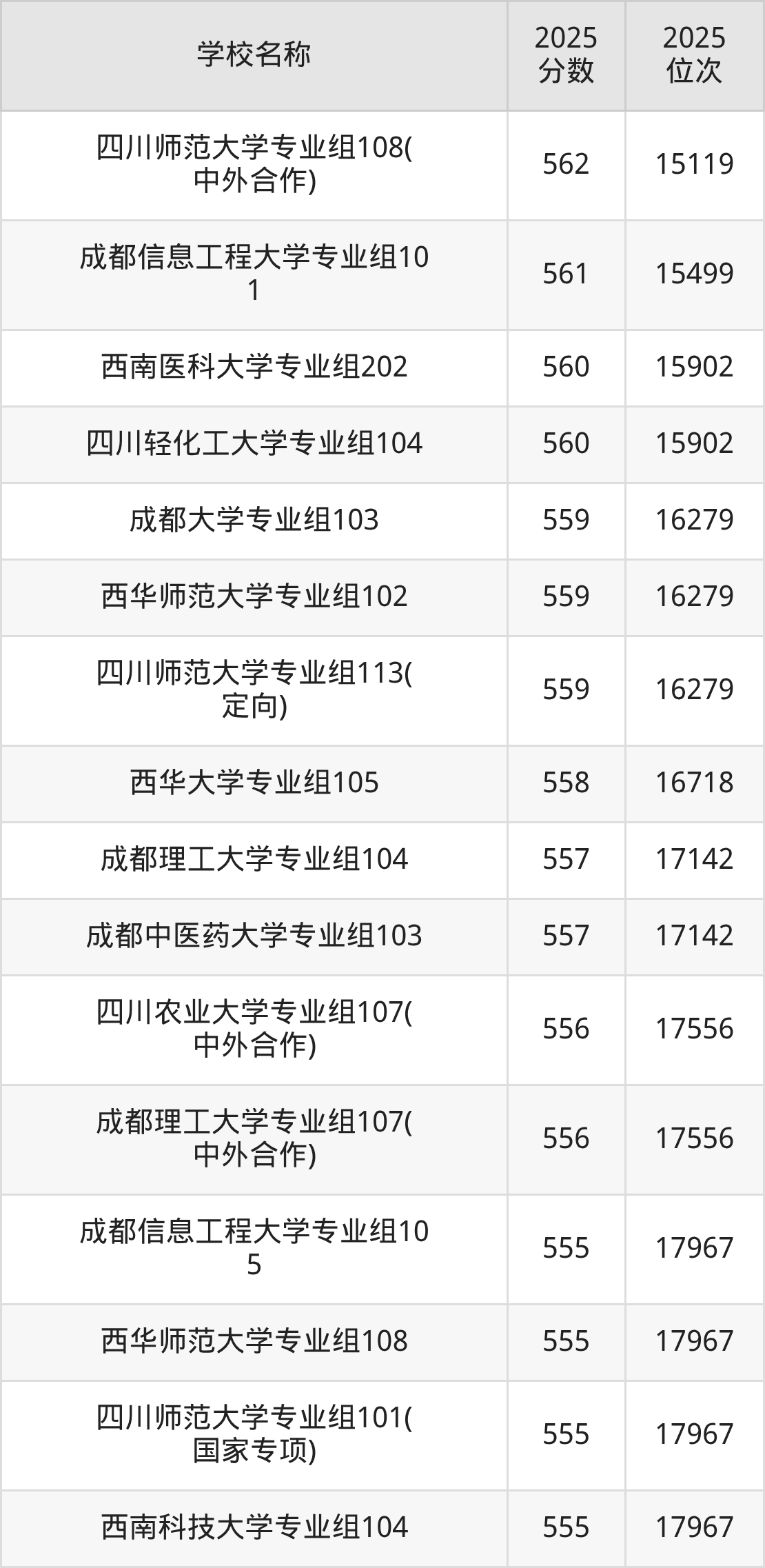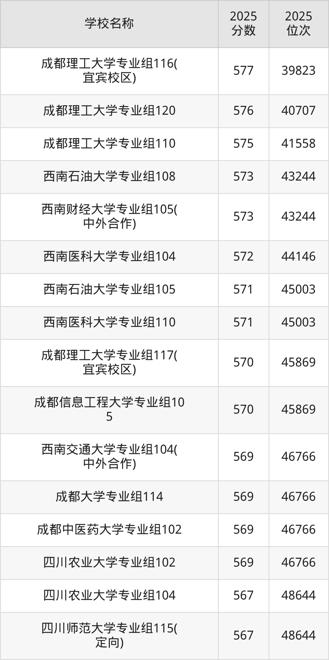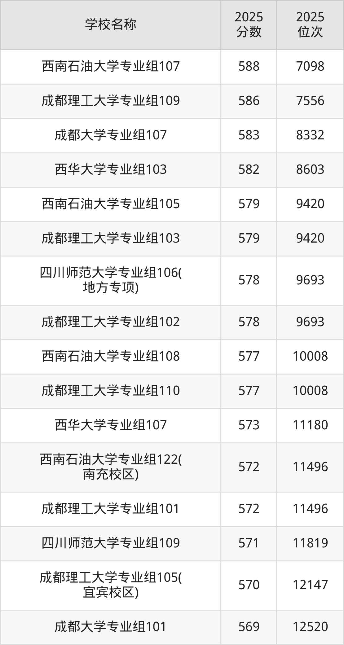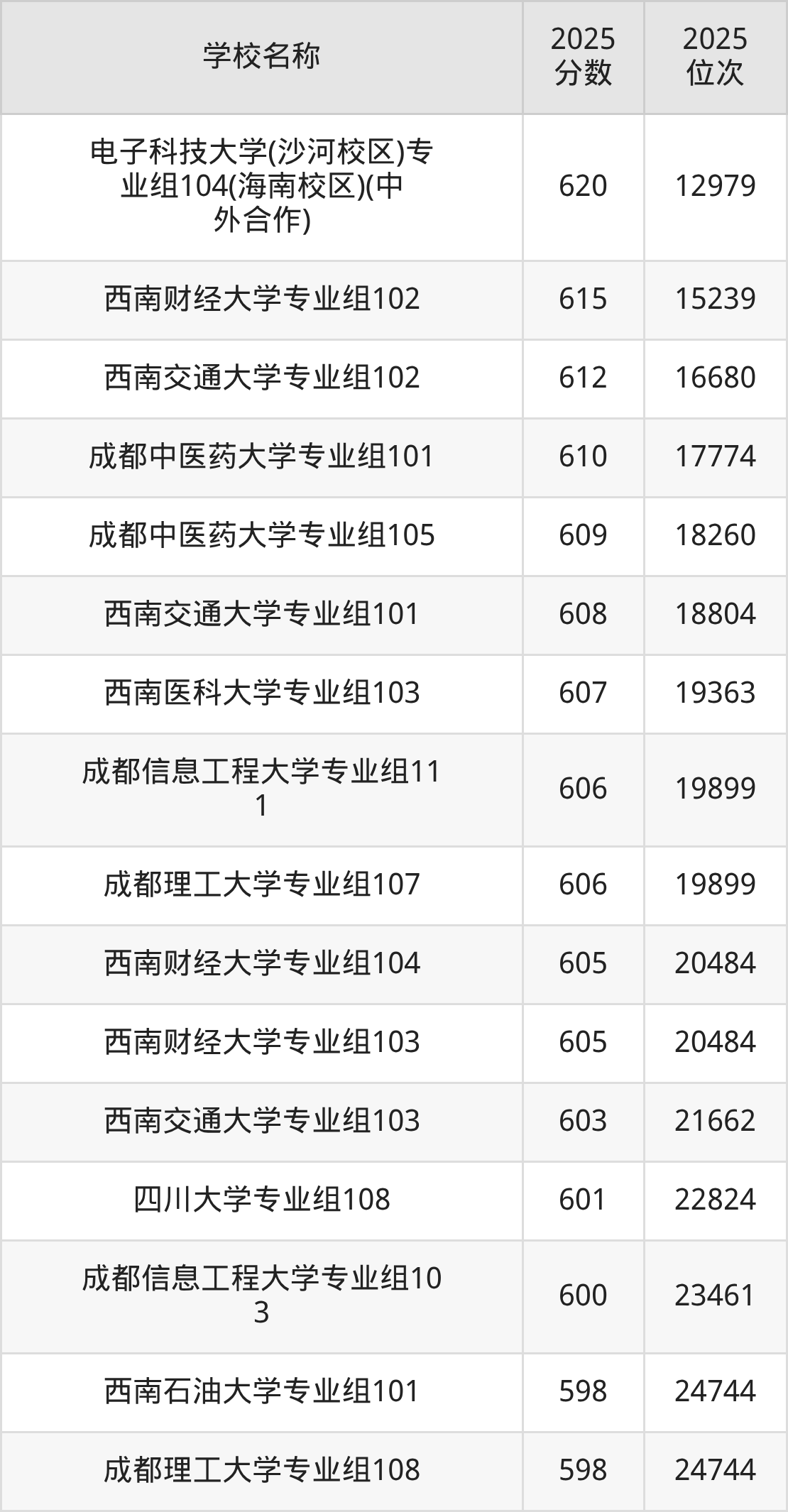 下文为2025年四川省一本大学在四川物理类录取分数线和位次排名表,供大家参考:
