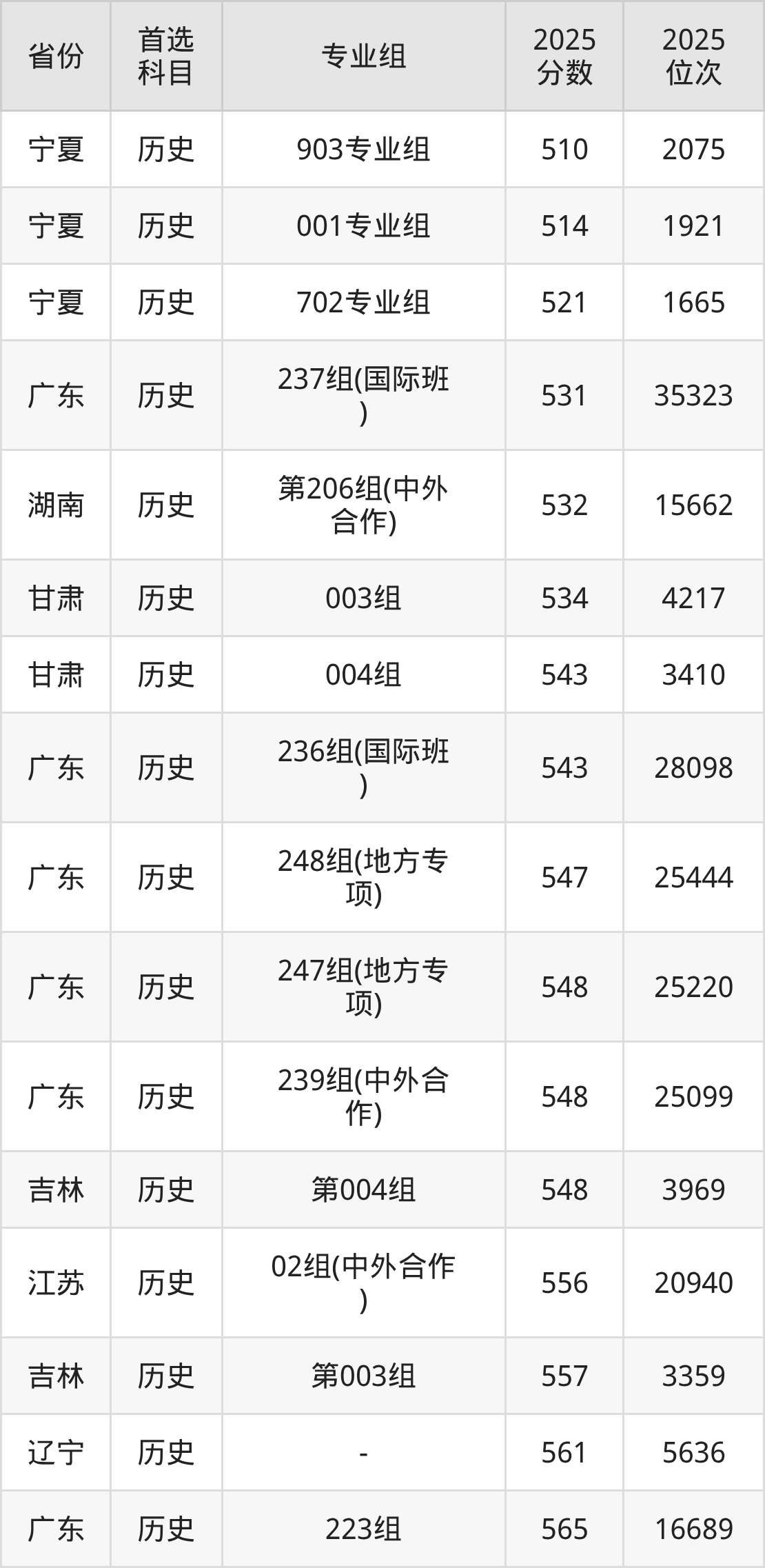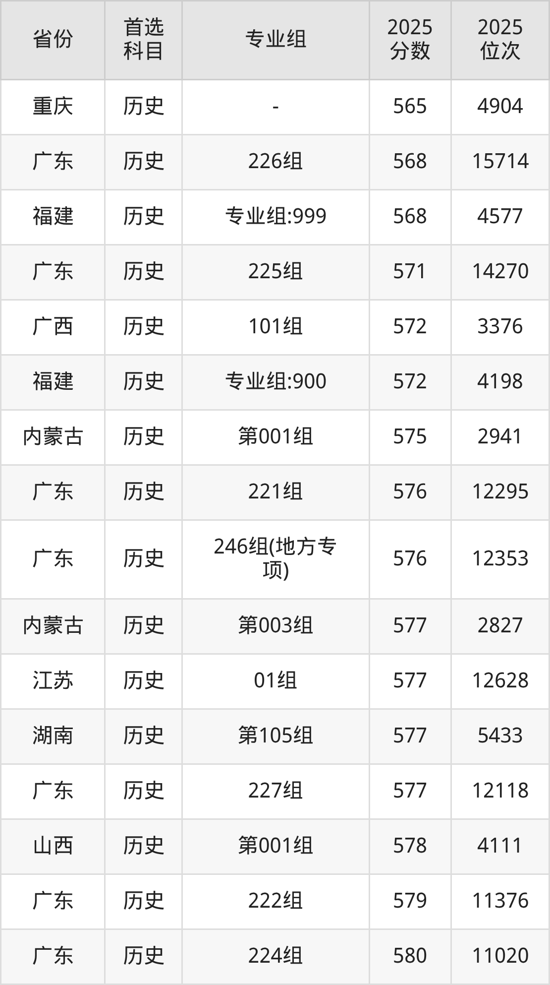 历史类:111组(地方免费师范生)556分、12670名,112组(地方免费师范生)550分、14518名,113组(地方免费师范生)560分、11176名,114组(地方免费师范生)550分、14419名,211组560分、11288名,212组558分、11983名,213组562分、10647名,214组541分、18134名,215组(中外合作)519分、28042名,222组(地方专项)529分、23314名,223组(地方专项)562分、10765名;