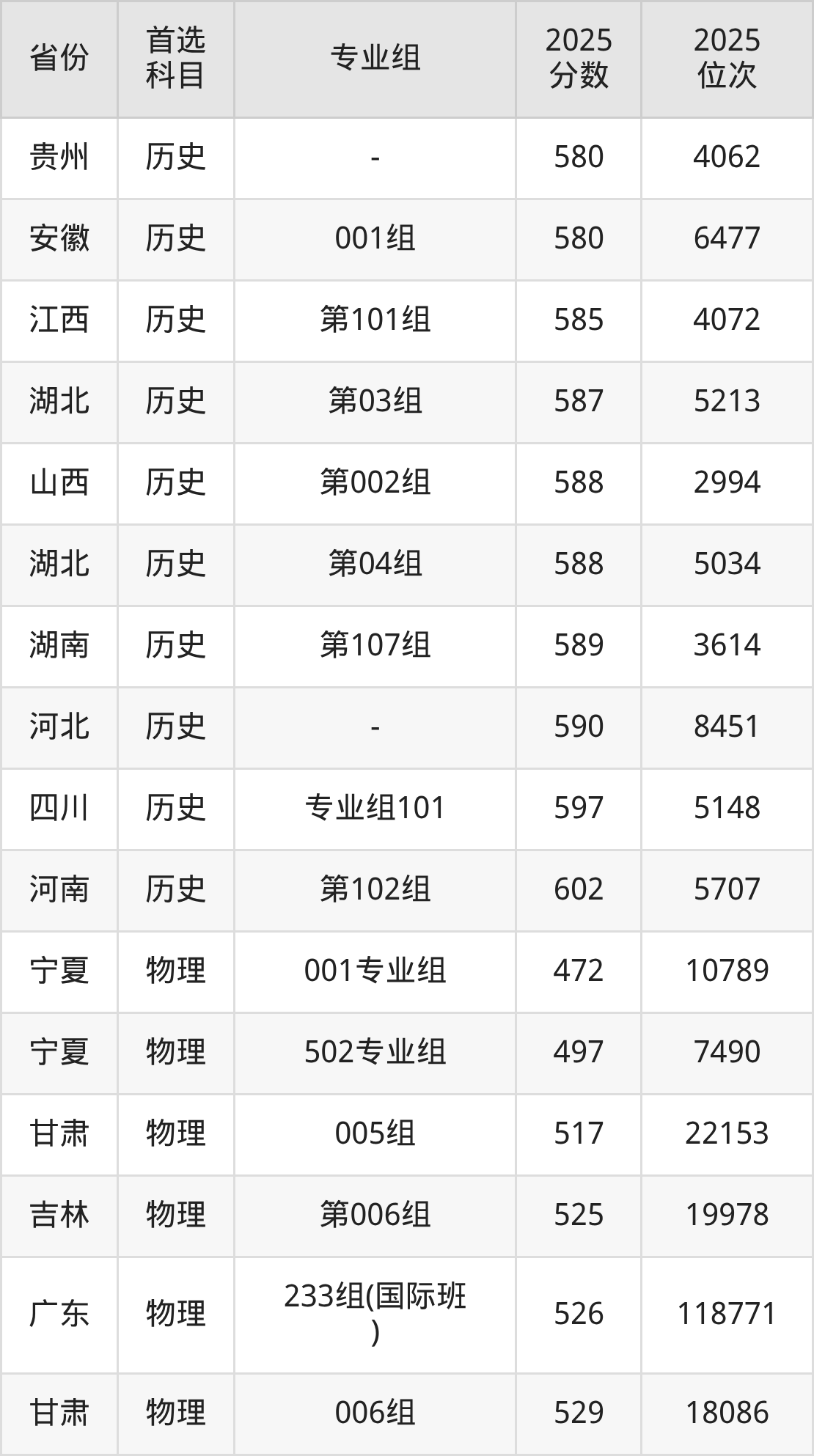 历史类最低分对应地区为宁夏(903专业组),录取位次为2075,超本科B106分;最高分对应地区为河南(第102组),录取位次为5707,超本科线131分。