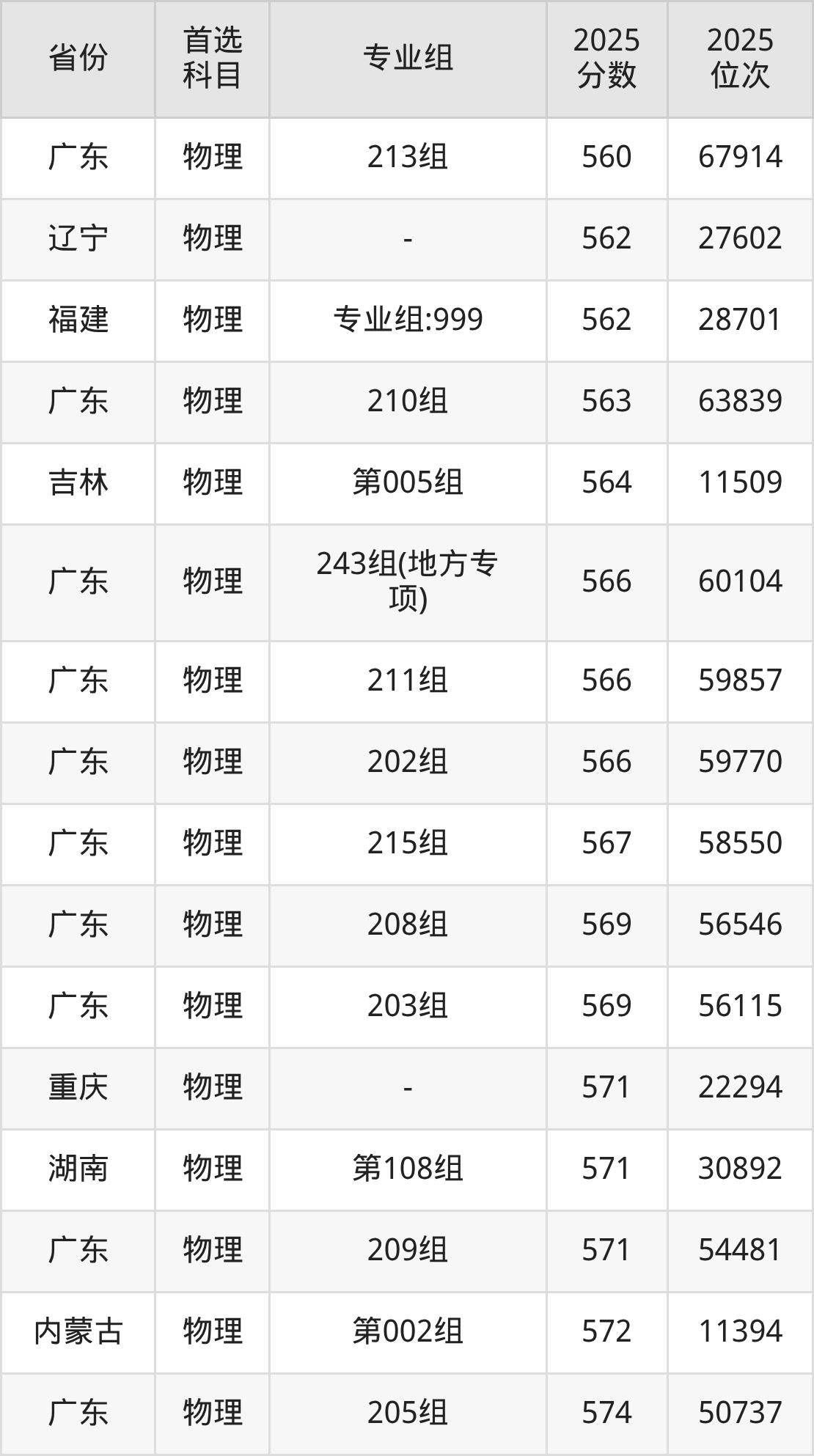 物理类:101组(地方免费师范生)554分、65093名,102组(地方免费师范生)546分、76023名,103组(地方免费师范生)533分、93901名,104组(地方免费师范生)549分、71626名,105组(地方免费师范生)563分、55124名,106组(地方免费师范生)562分、55300名,107组(地方免费师范生)577分、40071名,108组(地方免费师范生)564分、53898名,201组551分、68616名,202组552分、67305名,203组546分、75046名,204组562分、55732名,205组(中外合作)536分、89227名,220组(地方专项)532分、95103名,221组(地方专项)533分、93533名;