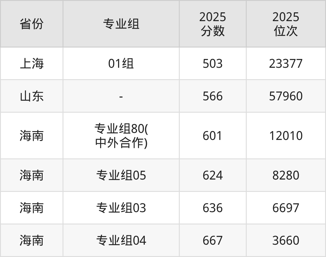 最低分对应地区为上海(01组),录取位次为23377,超本科线101分;最高分对应地区为海南(专业组04),录取位次为3660,超本科线187分。
