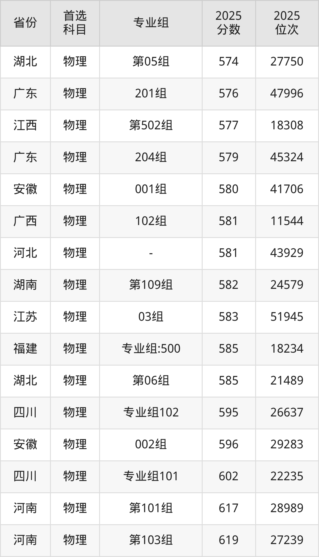 物理类:101组(地方免费师范生)589分、35719名,102组(地方免费师范生)580分、43608名,103组(地方免费师范生)581分、42697名,104组(地方免费师范生)578分、45402名,105组(地方免费师范生)573分、50227名,106组(地方免费师范生)574分、49255名,107组(地方免费师范生)597分、29390名,108组(地方免费师范生)558分、66000名,109组(地方免费师范生)555分、69388名,110组(地方免费师范生)552分、72913名,201组584分、40023名,202组573分、50227名,203组570分、53269名,204组453分、214598名,205组560分、63777名,206组569分、54261名,207组557分、67187名,208组562分、61558名,209组566分、57378名,210组570分、53269名,211组557分、67187名,231组(地方专项)544分、82505名,241组(中外合作)546分、80085名。