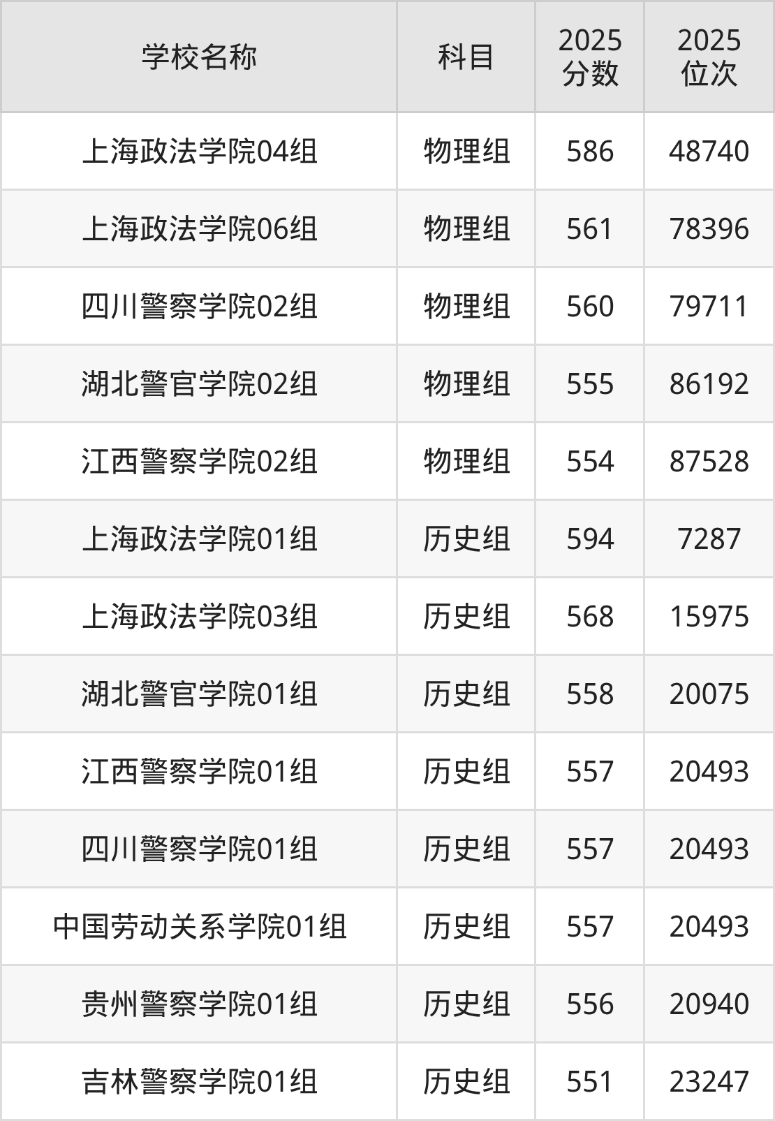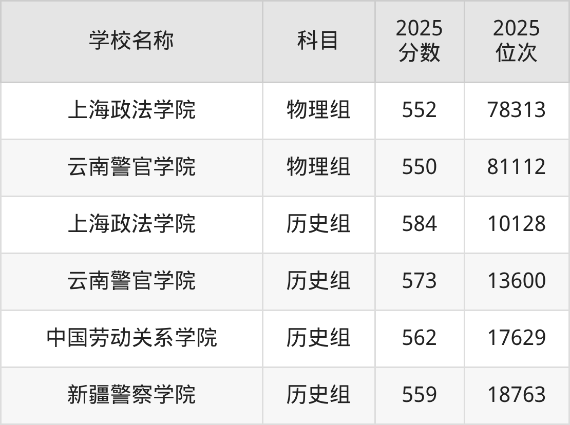 河北高考历史组共有4所二本政法大学在550到600分之间录取,包含上海政法学院、云南警官学院、中国劳动关系学院、新疆警察学院。