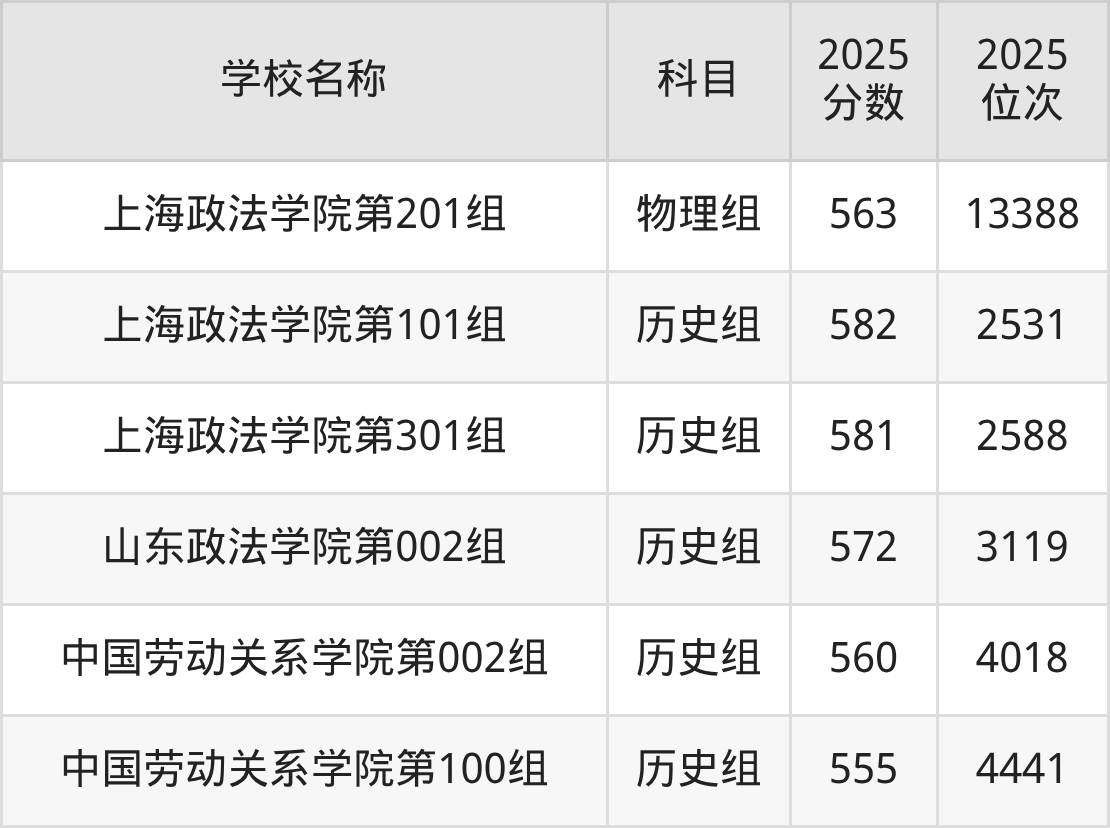 内蒙古高考历史组共有3所二本政法大学在550到600分之间录取,包含上海政法学院、山东政法学院、中国劳动关系学院。