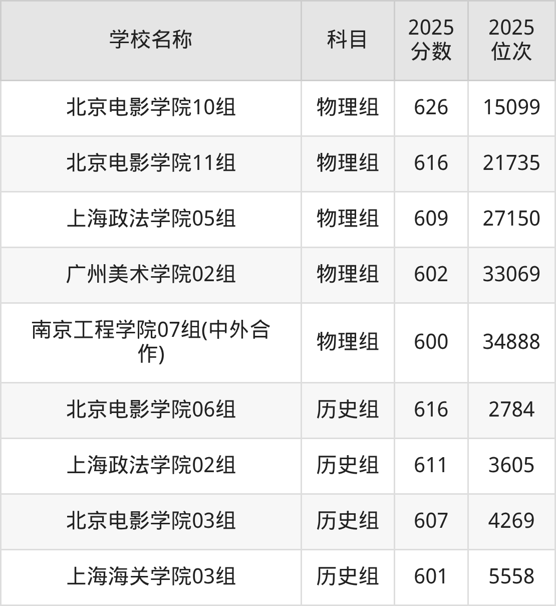 江苏高考历史组共有3所二本公办大学在600到650分之间录取,包含北京电影学院、上海政法学院、上海海关学院。