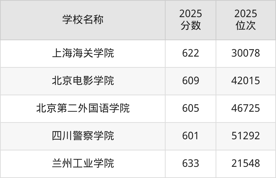 浙江高考共有5所二本公办大学在600到650分之间录取,包含兰州工业学院、上海海关学院、北京电影学院、北京第二外国语学院、四川警察学院。