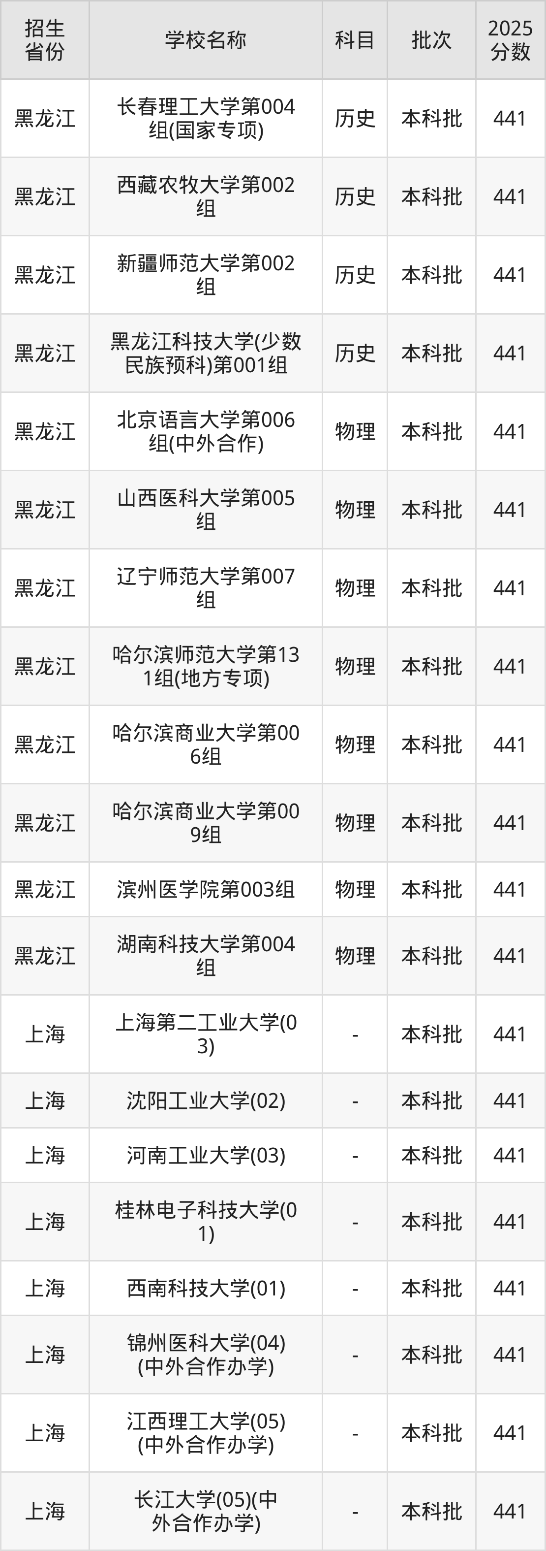 黑龙江省历史组分数线是441分的一本大学有:长春理工大学、西藏农牧大学、新疆师范大学、黑龙江科技大学(少数民族预科)。