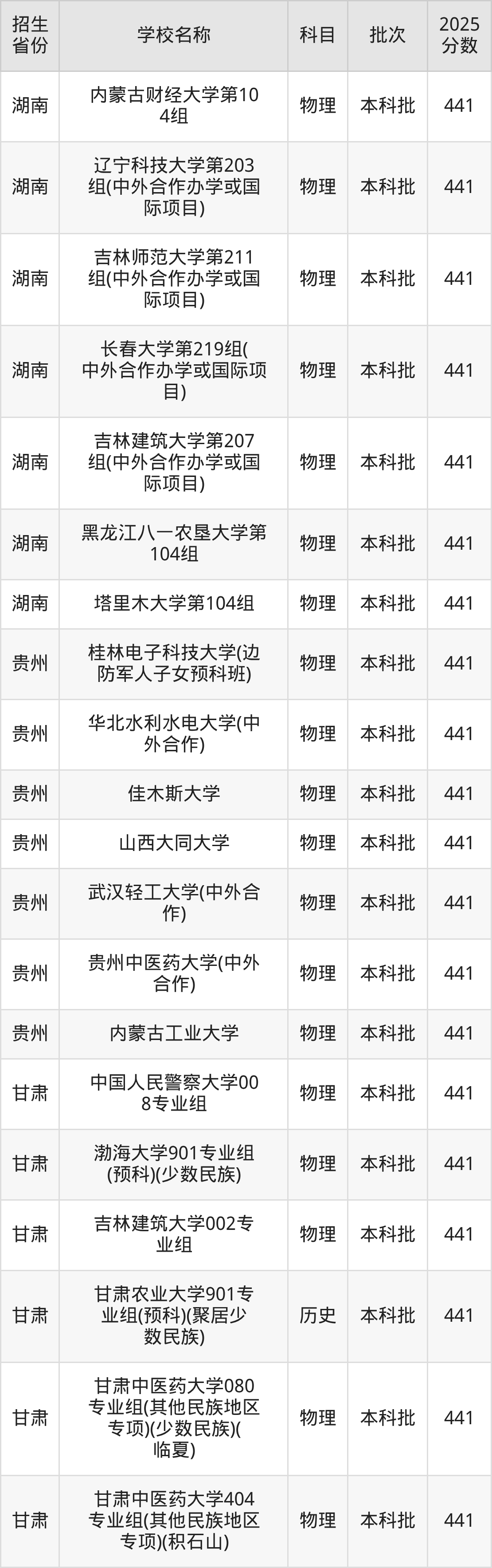 湖南省物理组分数线是441分的一本大学有:内蒙古财经大学、辽宁科技大学、吉林师范大学、长春大学、吉林建筑大学、黑龙江八一农垦大学、塔里木大学。