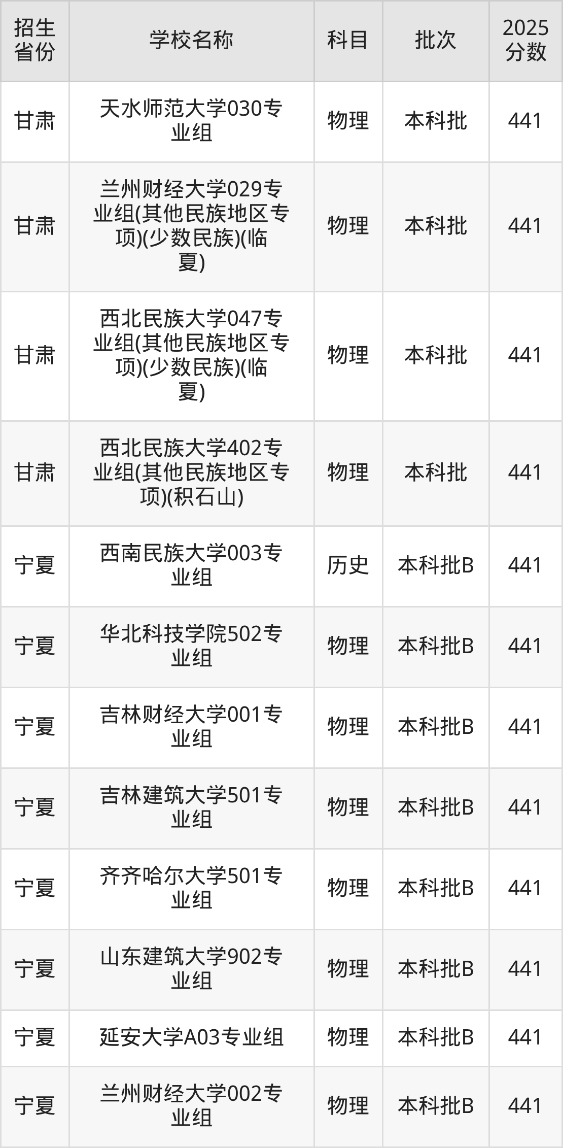 宁夏回族自治区物理组分数线是441分的一本大学有:应急管理大学、吉林财经大学、吉林建筑大学、齐齐哈尔大学、山东建筑大学、延安大学、兰州财经大学。
