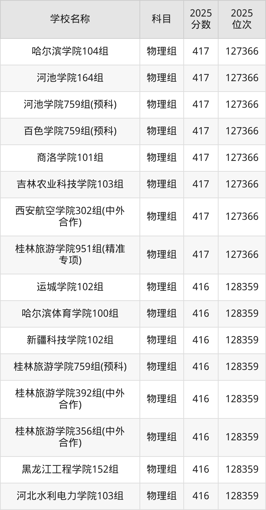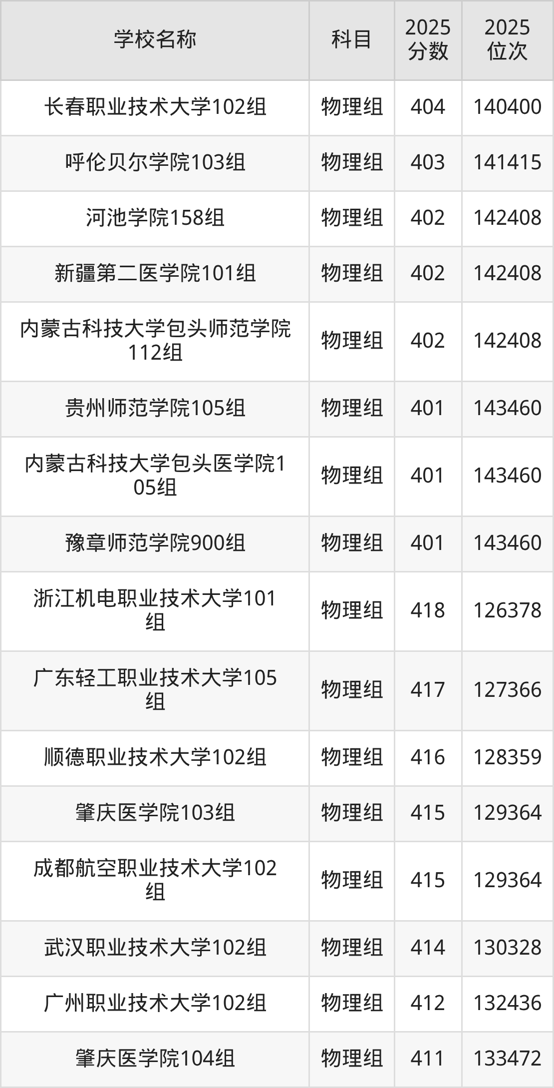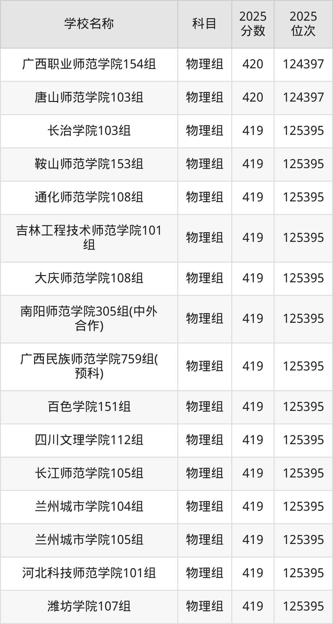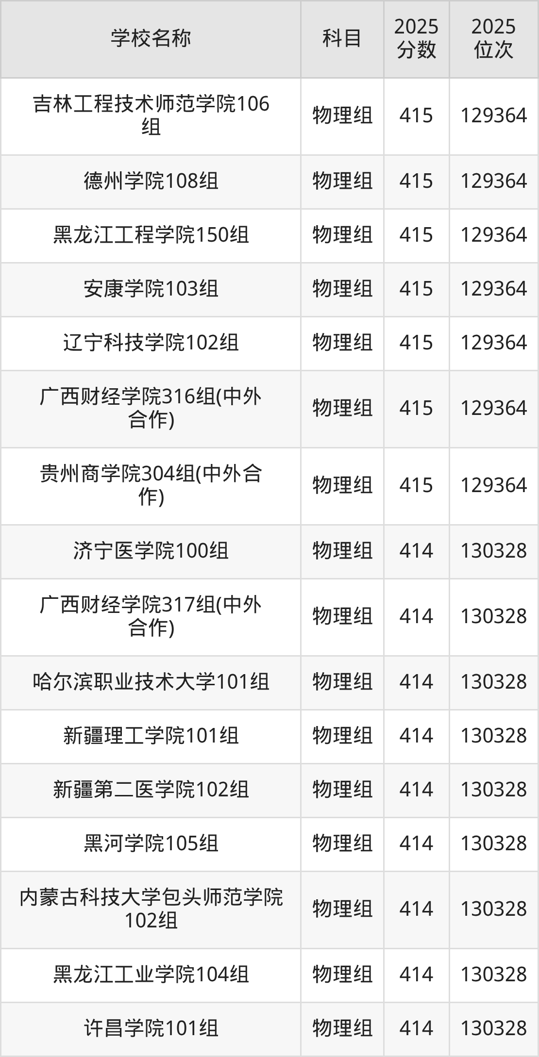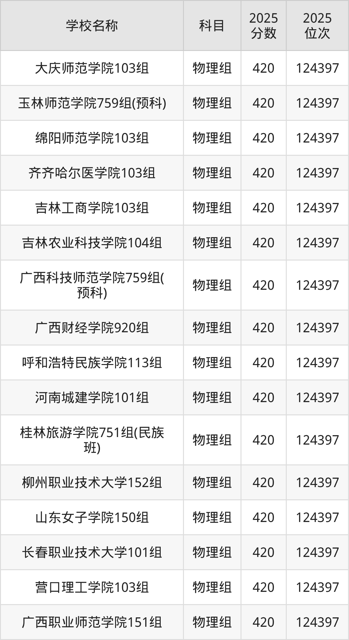 广西高考物理组共有103所二本公办大学在400到420分之间录取,包含唐山师范学院、大庆师范学院、玉林师范学院、绵阳师范学院、齐齐哈尔医学院、吉林工商学院、吉林农业科技学院、广西科技师范学院、广西财经学院、呼和浩特民族学院。