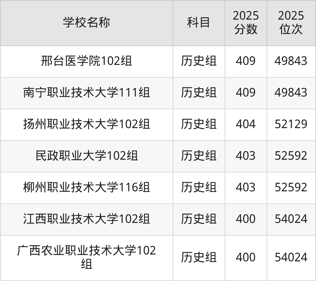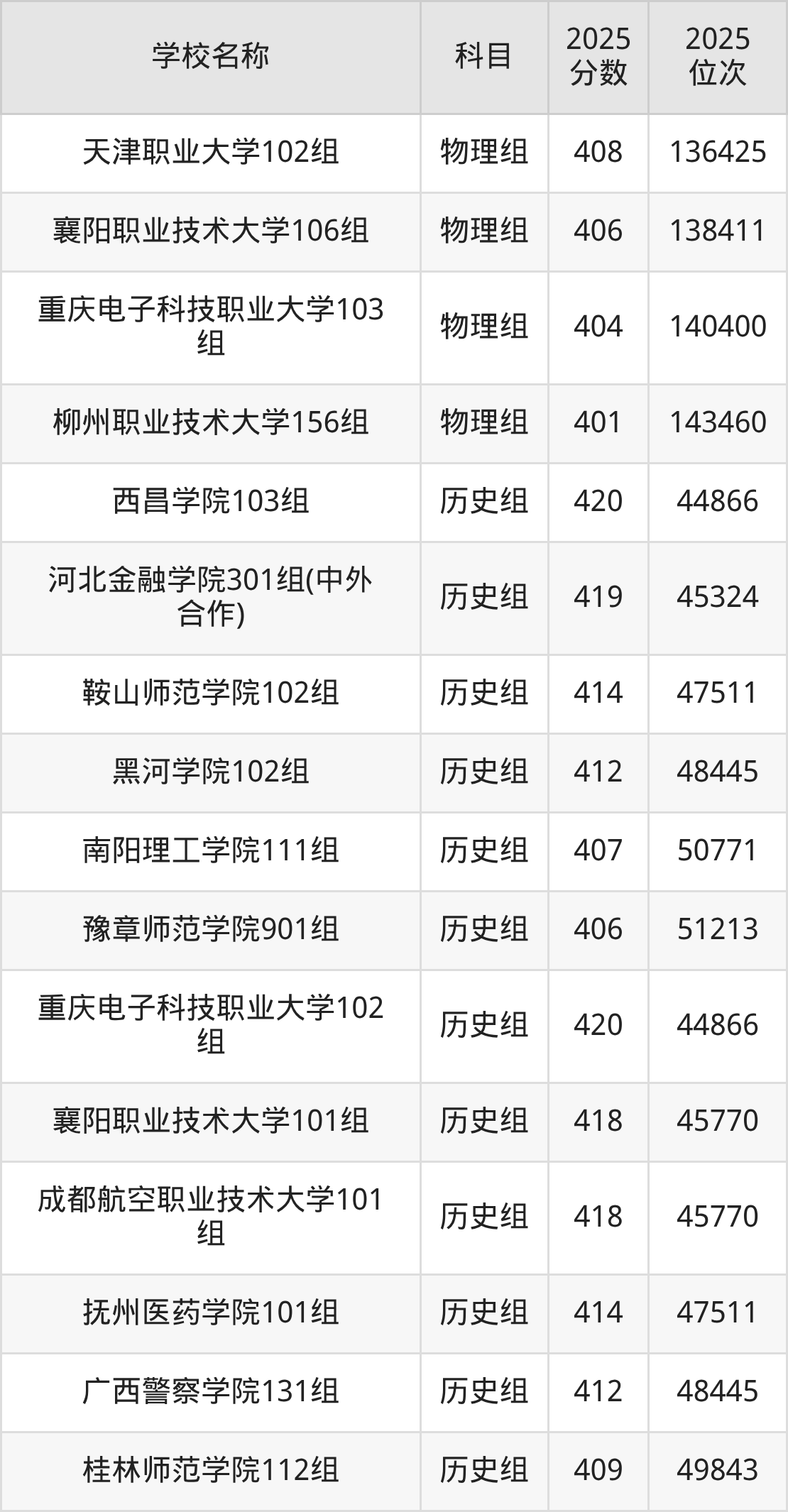 广西高考历史组共有19所二本公办大学在400到420分之间录取,包含西昌学院、重庆电子科技职业大学、河北金融学院、成都航空职业技术大学、襄阳职业技术大学、鞍山师范学院、抚州医药学院、黑河学院、广西警察学院、南宁职业技术大学。