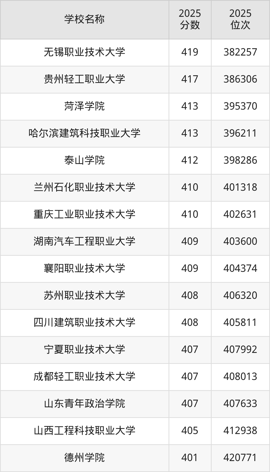 山东高考共有16所二本公办大学在400到420分之间录取,包含无锡职业技术大学、贵州轻工职业大学、菏泽学院、哈尔滨建筑科技职业大学、泰山学院、兰州石化职业技术大学、重庆工业职业技术大学、湖南汽车工程职业大学、襄阳职业技术大学、苏州职业技术大学。