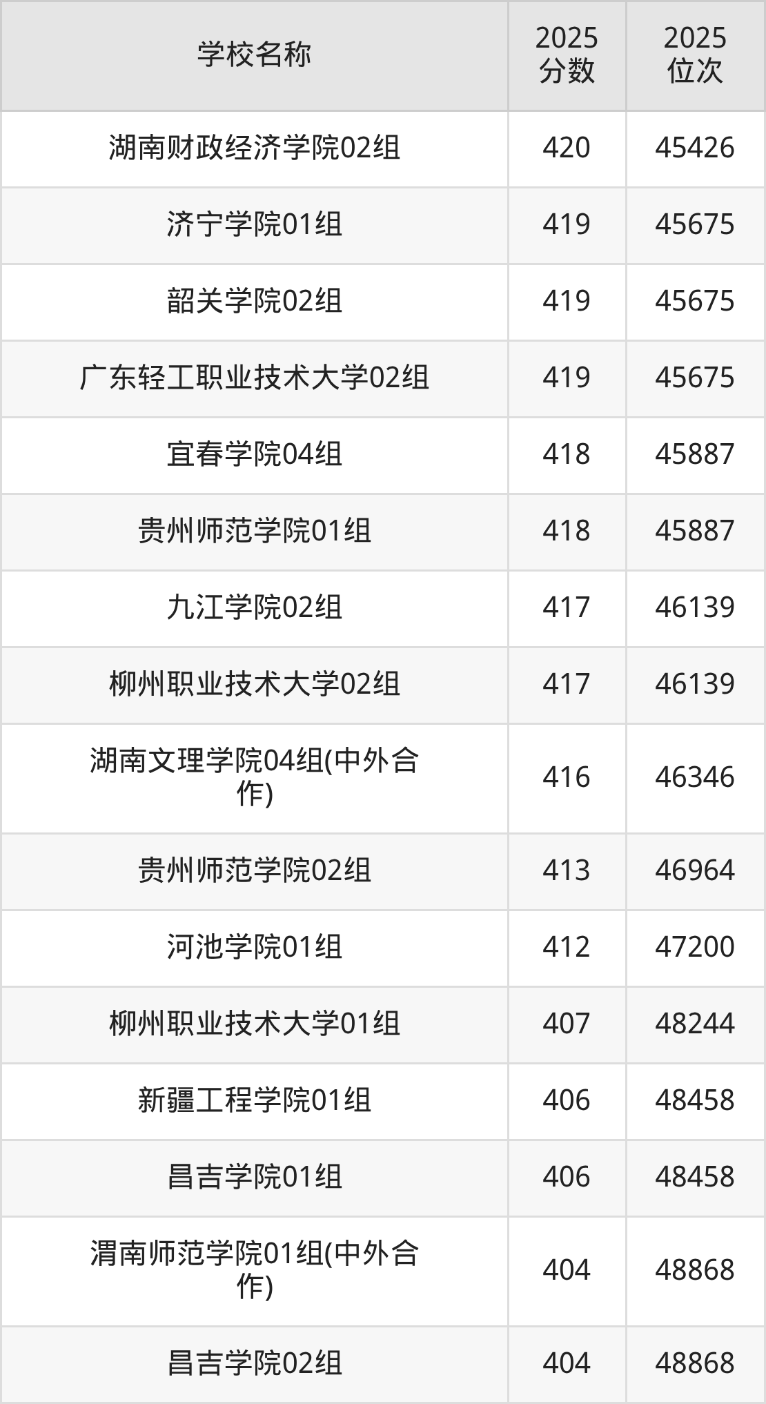 上海高考共有15所二本公办大学在400到420分之间录取,包含湖南财政经济学院、济宁学院、韶关学院、广东轻工职业技术大学、宜春学院、贵州师范学院、九江学院、柳州职业技术大学、湖南文理学院、河池学院。