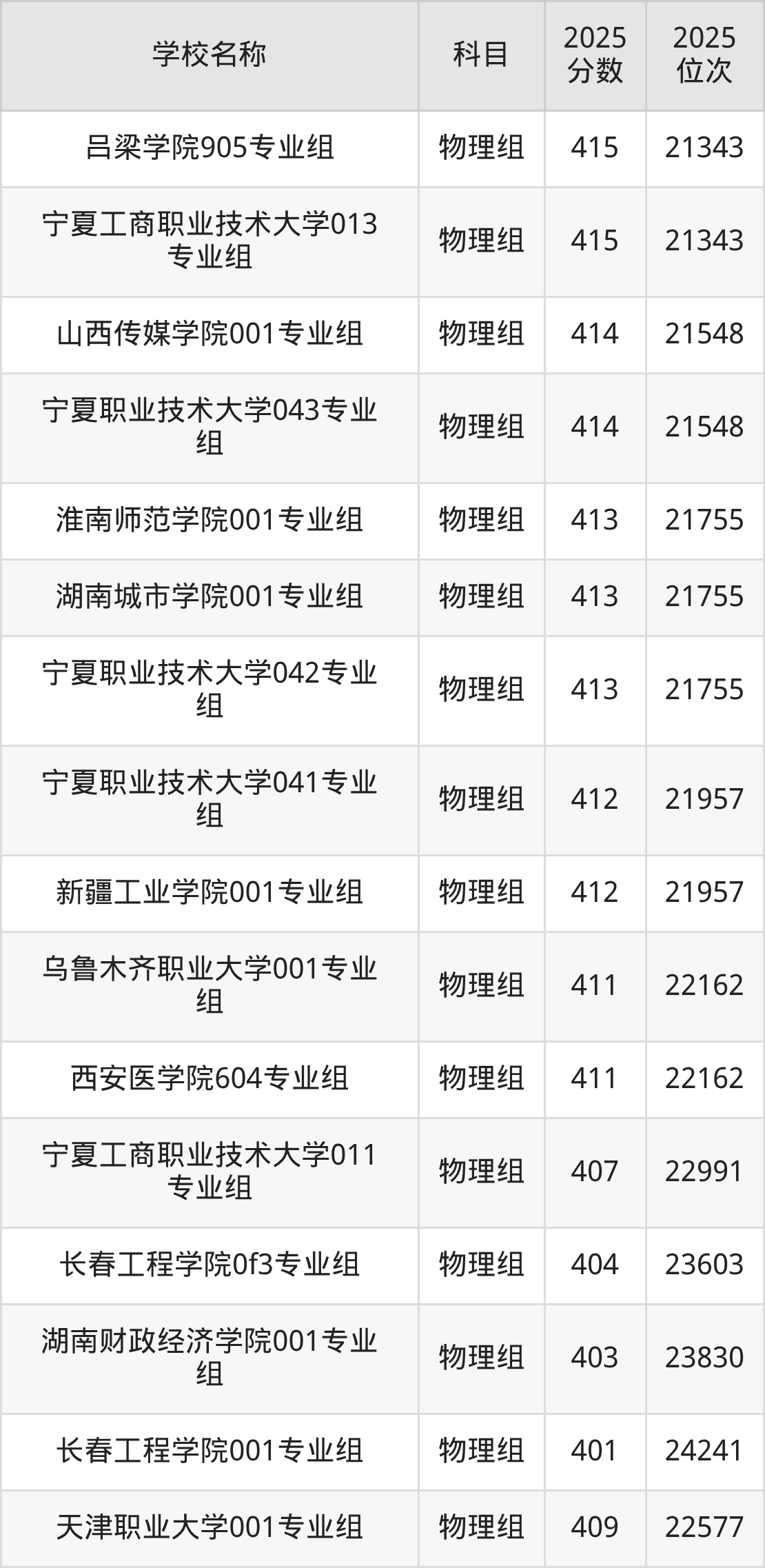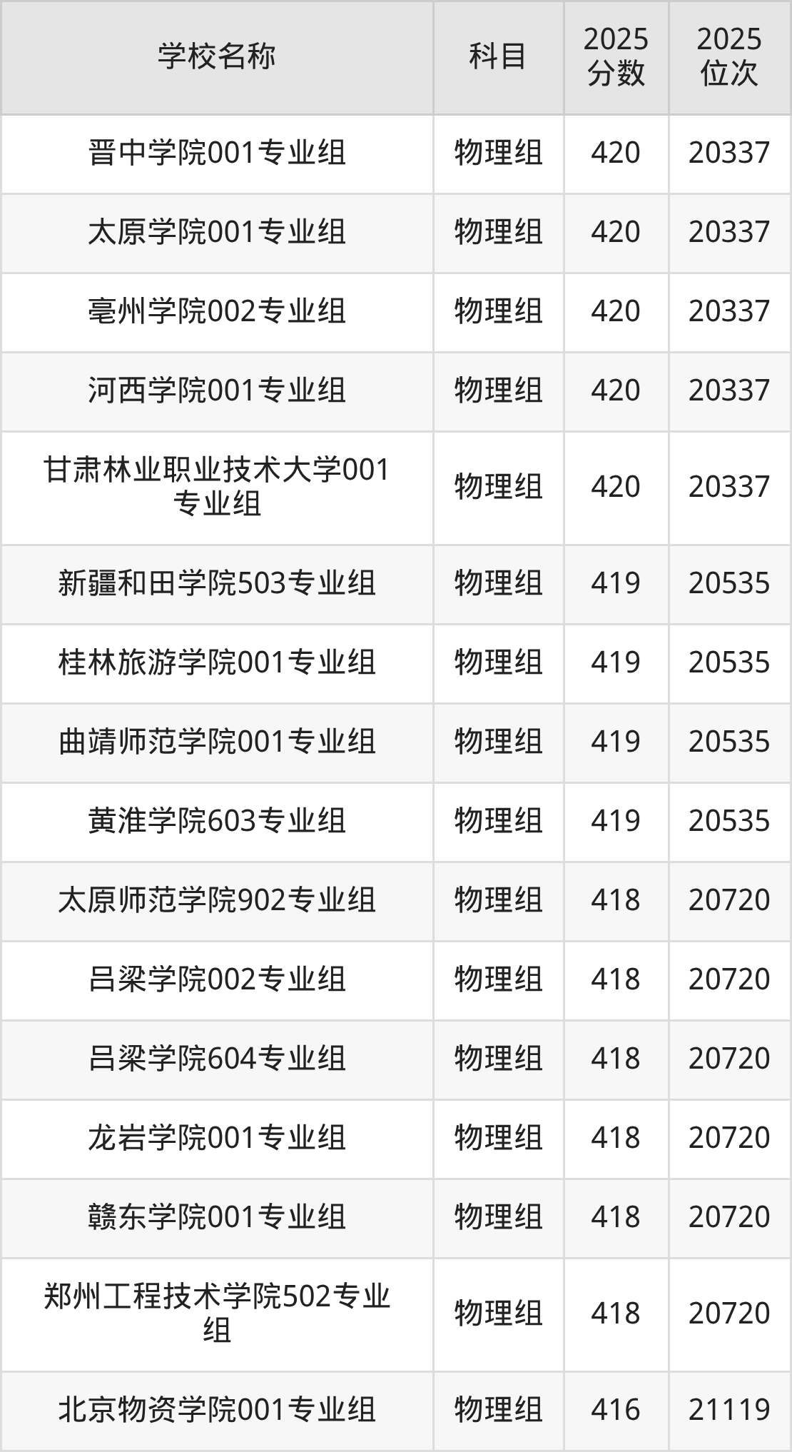 宁夏高考物理组共有28所二本公办大学在400到420分之间录取,包含晋中学院、太原学院、亳州学院、河西学院、甘肃林业职业技术大学、黄淮学院、桂林旅游学院、曲靖师范学院、新疆和田学院、太原师范学院。