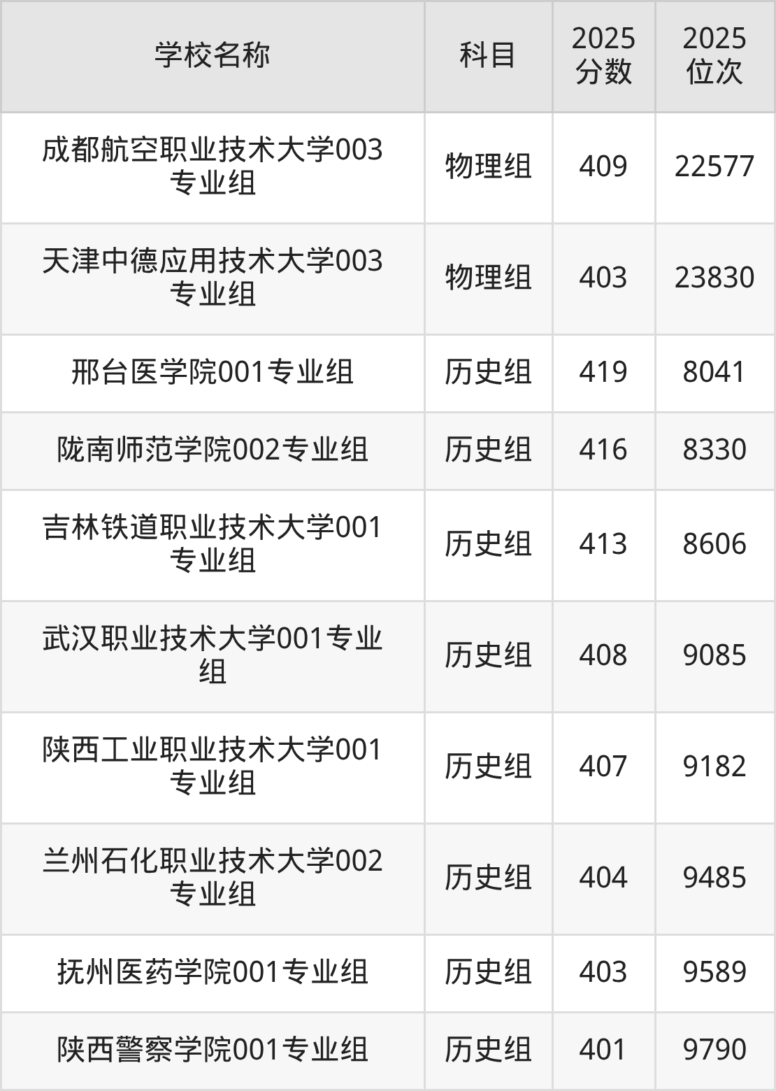 宁夏高考历史组共有8所二本公办大学在400到420分之间录取,包含邢台医学院、陇南师范学院、吉林铁道职业技术大学、武汉职业技术大学、陕西工业职业技术大学、兰州石化职业技术大学、抚州医药学院、陕西警察学院。