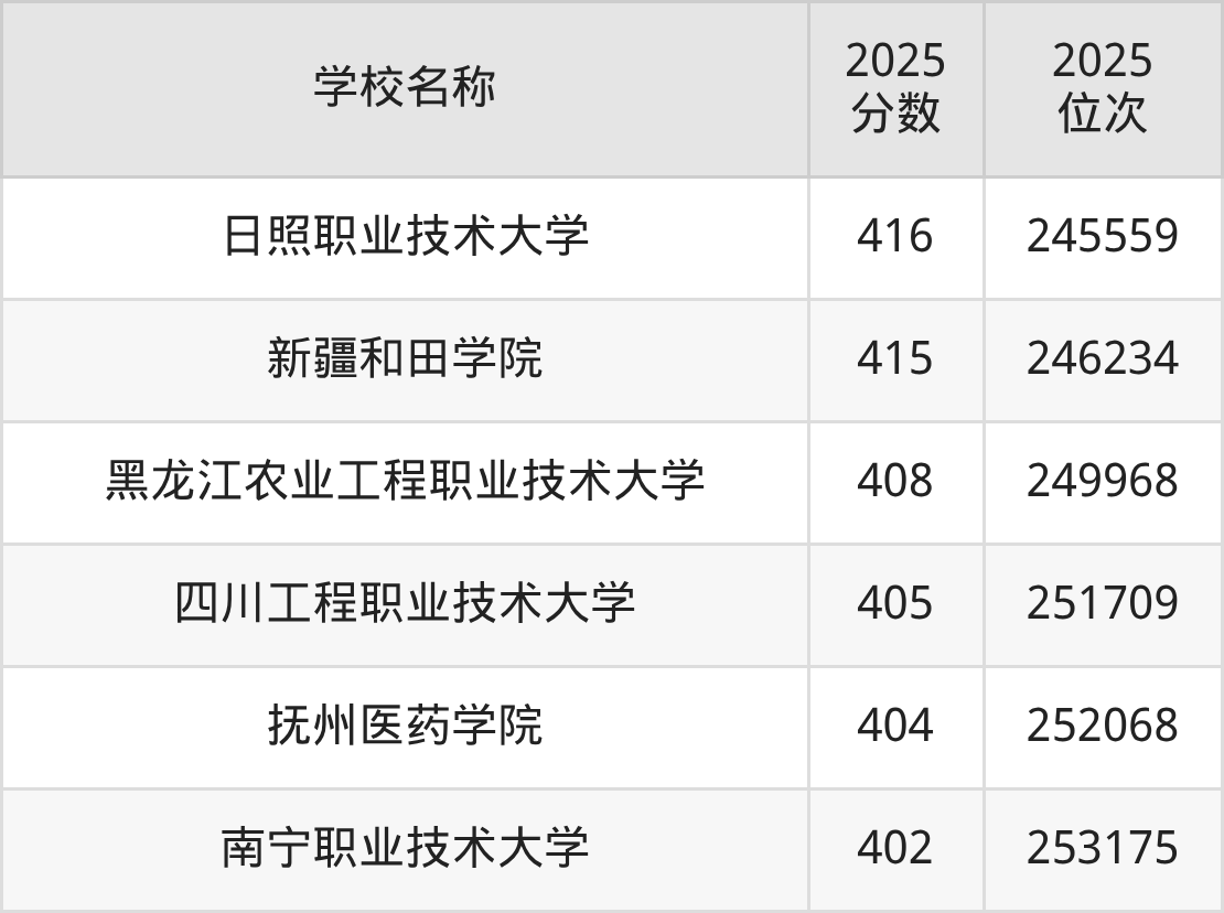 浙江高考共有6所二本公办大学在400到420分之间录取,包含日照职业技术大学、新疆和田学院、黑龙江农业工程职业技术大学、四川工程职业技术大学、抚州医药学院、南宁职业技术大学。
